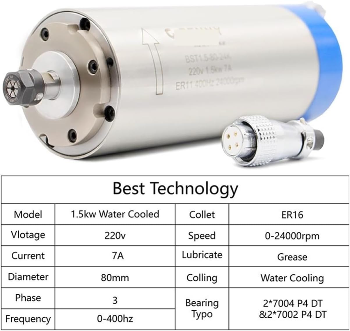 Slotting Cutter Arbors1x 1.5kw ER16 water cooled spindle 4 bearings 80x220mm1 x 1.5kw inverterSize: 80x220mm (midbody diameter: 80mm; length: 220mm)Speed regulation method: Through the three-phase inverter output, adjust the inverter frequency to change the spindle speed.Cooling method: water coolingPower: 1.5kw (1HP=0.725kw)Voltage: 220vACFrequency: 0-400HzSpeed: 0-24000rpmRunout deviation: 0.01mmFully sealed P4 angular contact bearingsBearing type: 2×7004C P4 DT&2×7002C P4 DT4 bearingsWater-cooled ER16 chuck block