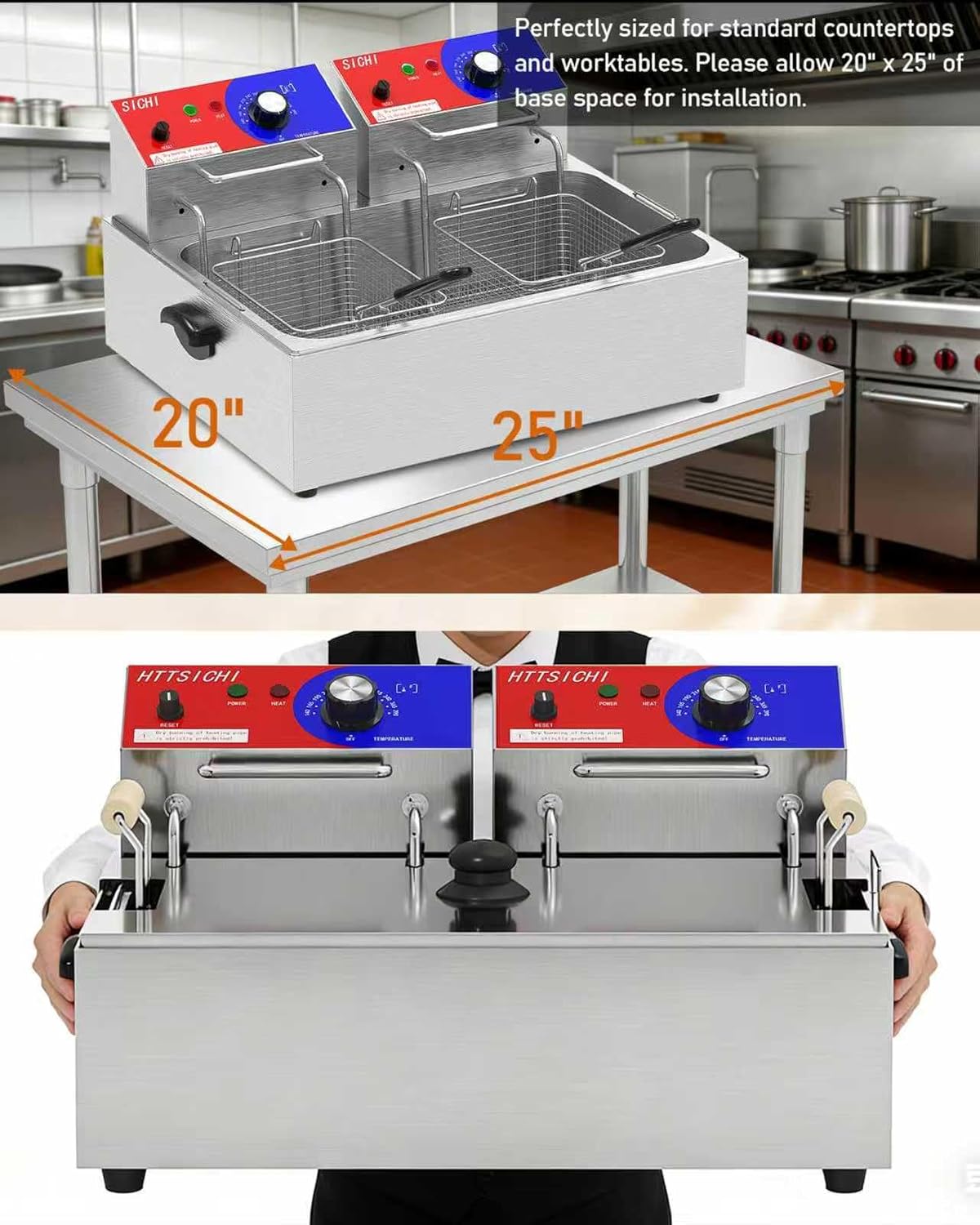 LARGE CAPACITY FRYER WITH 3 BASKETS: This commercial deep fryer features a 22L oil tank fitting a 4.4lb whole chicken. Includes one large and two small frying baskets for flexible batch cooking. 304 stainless steel construction with heat-resistant handles FAST HEATING & PRECISE TEMPERATURE CONTROL: Dual 1700W elements heat oil to 390°F in under 10 minutes. Adjustable 0-390°F control with U-shaped tubes ensures even heat distribution for perfectly crispy fried foods every batch HIGH-VOLUME CONVEYOR TOASTER: This commercial toaster delivers up to 150 slices per hour with a 7" wide conveyor. Accommodates bread, bagels, and Texas toast. Standby mode conserves energy between meal periods VERSATILE & EASY TO OPERATE: Front/rear dispensing chutes with 3" slot for various bread products. Simple dial controls conveyor speed for customized toasting. Stainless steel exterior with pull-out crumb tray for easy cleaning IDEAL FOR COMMERCIAL & HOME USE: Perfect for restaurants, hotels, cafes, and food service. Great for frying whole chicken, wings, fries, and toasting bread, bagels, and buns. Overheat protection ensures safe, long-lasting performance