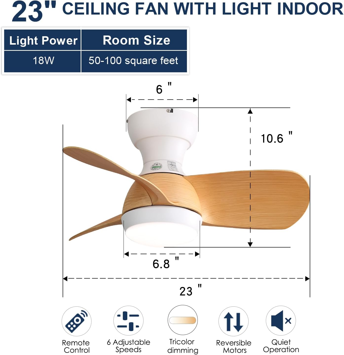 23 Inch Ceiling Fan With Light Color: Light Wood Grain Blades/ White Body Blades Size: 23" Power Source: Reversible Dc Motor Voltage: 120V/60Hz Light Source: 3CCT LED 18W Controller Type: Remote Control Special Feature: Timer Certification: ETL Product Dimensions: 34"L x 29.5"W x 21.5"H Room Type:Farmhouse, Restaurant, Rustic, Garage,, Living Room, Bedroom, Home Office, Kids Room, Balcony, Cabinet, Garage, Garden, Home, Shop,, Dining Room Reversible Dc Motor Reversible DC Motor Quiet Energy saving, Function Includes Forward and Reverse for Summer and Winter 2 Airflow Modes, Cooling In Summer and Keeping Warm in Winter. 3 Durable ABS Blades This ceiling fan is made of high quality ABS material and stainless steel, which is strong and durable. The waterproof design of the fan body can effectively protect the internal structure from rain and dust, and is very suitable for indoor use. Indoor Decorative For Home The diameter of this small ceiling fan is only 23 inches, which is very space-saving, but the propeller design of the fan blade makes it easy to move a lot of air.t.
