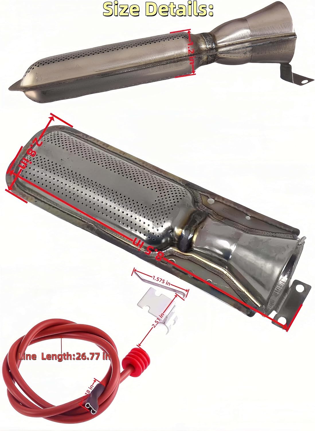 010799 Furnace Burner Tube Dimensions: 8.5 L inch X 2.8 W inch X 1.2 H inch. 232286 Single Probe Gas Furnace Igniters Electrode Length: 27" Easy Installation: Be sure that the power has been cut off and work gloves are worn to protect safety before installation. Installing the ignition needle is a breeze. Simply remove the old gas furnace igniter and replace it with the new one in the original position. If you're not sure how to install it, you can search for installation videos on the internet. Reliable Replacement Part: Have Heat Again in the Chilly Weather Camping: The RV furnace burner head for LP gas furnaces construct of durable metal materials to fix your rusted/ plugged camper furnace heater and prolong lifespan. Improve heating unit efficiency and reduce propane use by replacing with the new camper burner head. This spark and sensor electrode is designed for your RV Furnace and can provide reliable performance to keep your water heaters in top condition, allowing you to efficiently enjoy hot water on the go.