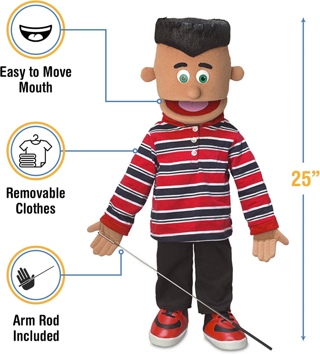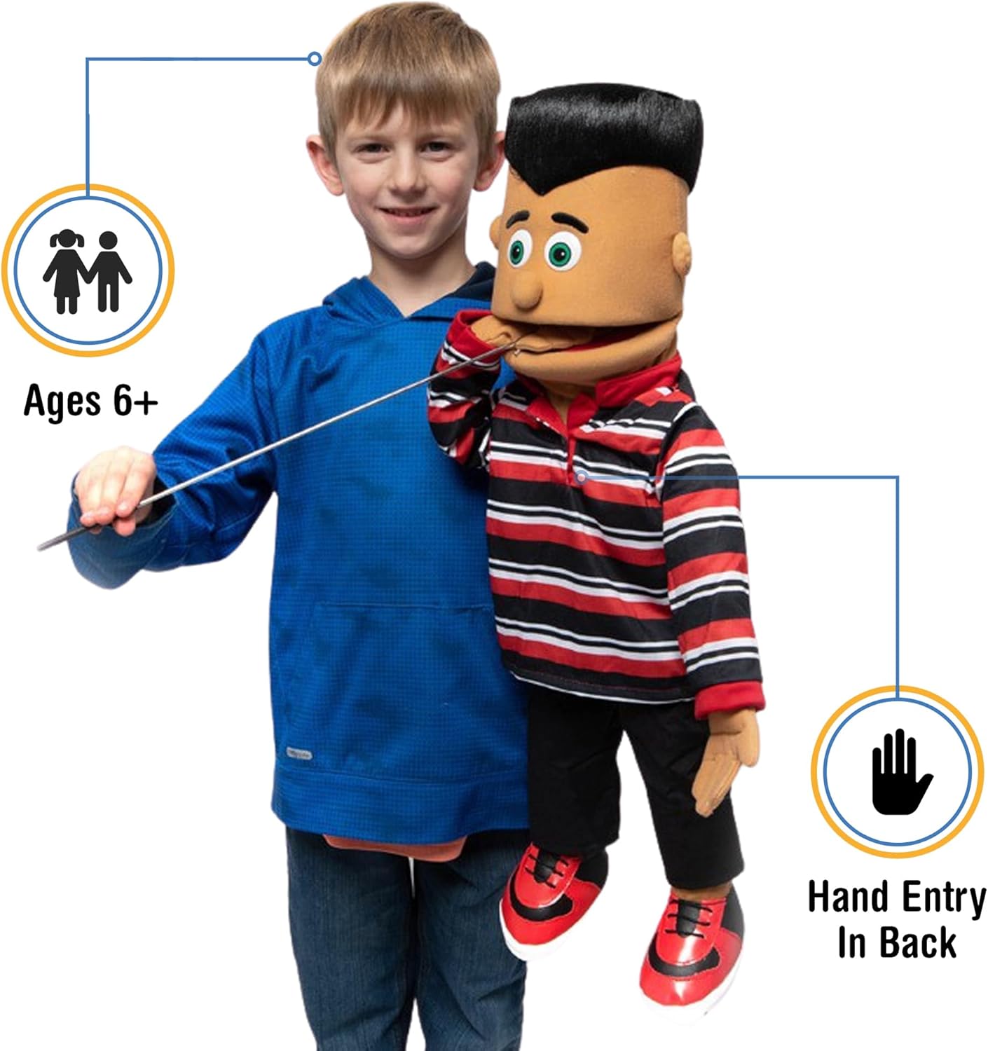Our new full body, performance quality, ventriloquist doll style puppets feature an incredibly easy moving mouth. They also come with a metal arm control rod. For those who have no idea what that means (dont worry, alot of people ask!) the rod is a thin metal "wand" that simply clips to either hand for movement. This is how Muppet and Sesame Street type puppets are operated. Simply insert your hand into the slot in the puppet's back to operate the mouth. By opening and closing your hand the puppet's mouth will move. Bodies are poly-fill stuffed and soft making them light-weight. They weigh in at about 1 pound. These puppets are very durable and are made to last a lifetime. The puppet comes completely dressed as shown (clothing may vary slightly due to fabric availability). Clothes are removable and this puppet wears child size 18 months. Our new 25" puppets are highly recommended for both beginners and experienced puppeteers. Their mouths are so easy to move and wont hurt your hand making them perfect for puppet ministry, school performances, talent shows, drama, theater, therapy, good clean fun at home, and more! Give them a try and we promise you wont be disappointed! Recommended for ages 5 and up. Children under this age would enjoy having an adult or older child operate it and put on the show for them.