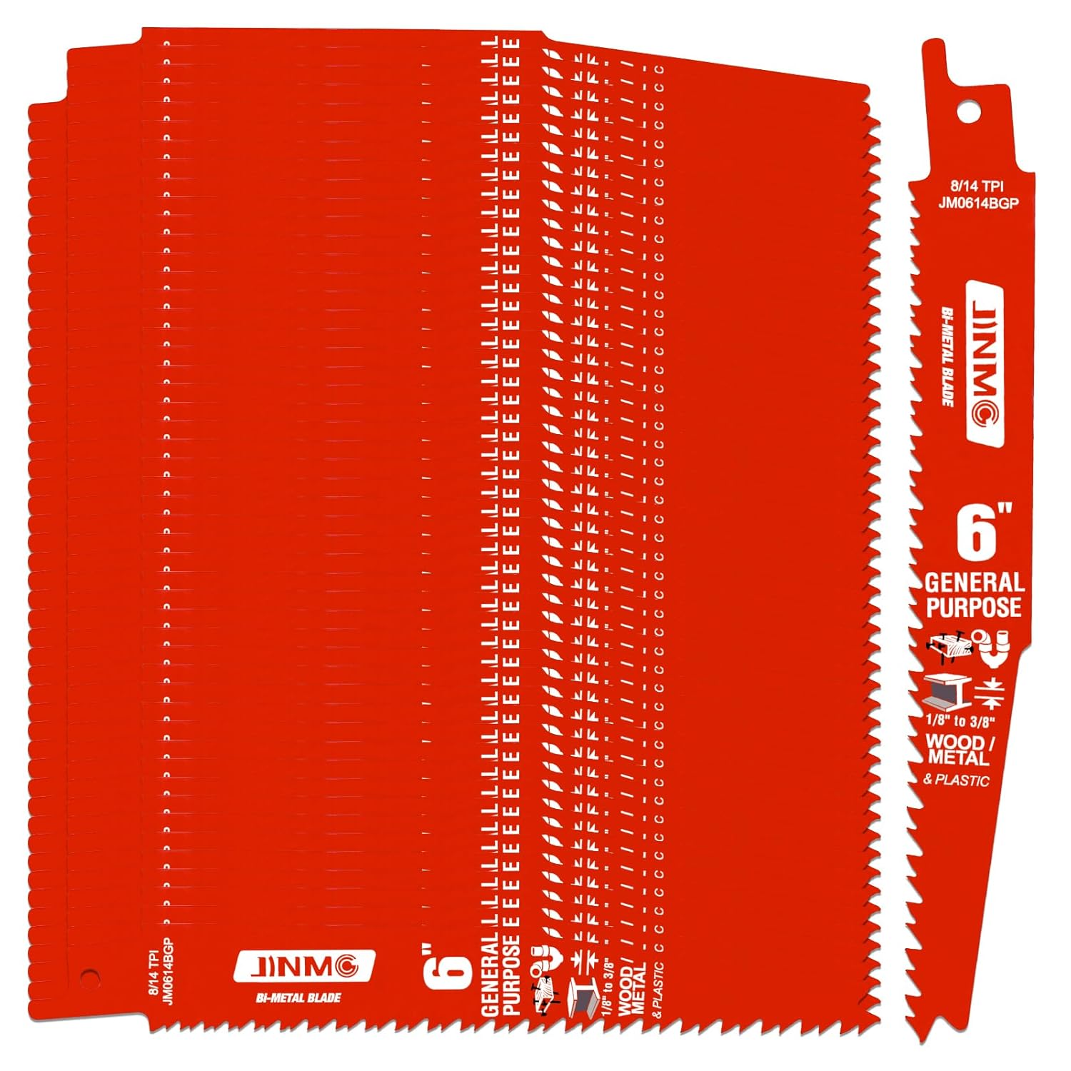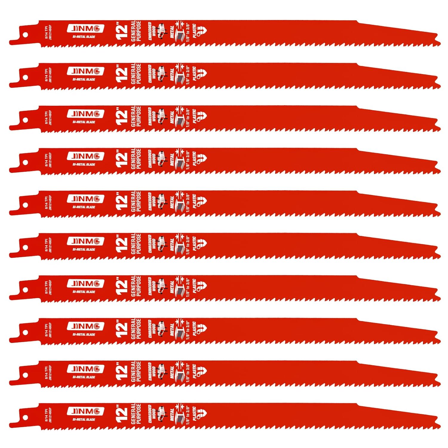 • Excellent Cutting Performance: JINMG Bi-Metal 8/14TPI Reciprocating Saw Blades are specifically designed for maximum performance in nail-embedded wood applications. when we trim wood containing nails such as abandoned fences, no longer have to worry about nail damage to the saw blade or frequently replace different kinds of reciprocating saw blades.