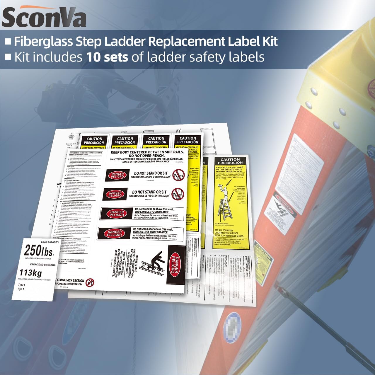 Sconva Step Ladder Safety Label Extension Ladder Stickers Replacement Label Kit Compatible with Ladder Inspection Stickers for Werner Fiberglass Extension Ladders (Pack of 10 Sets) Package Includes: 10 Sets x Fiberglass step ladder stickers Compatibility: Fiberglass step ladder label kits are compatible with werner ladder safety labels for all type 1 250 load capacity stepladders. Ladder Inspection Labels Features: 1. The function of ladder weight stickers is to remind the safety regulations for the use of ladders. 2. Extension ladder stickers replacement for safety & Instruction Labels. Ladder safety labels can guide people to take reasonable and effective actions to ensure their own and others' safety and make work more efficient. 3. Extension ladder inspection labels are made of weather resistant vinyl material. Ladder safety labels has good sealing and corrosion resistance, effectively prevent corrosion caused by water and other factors, and avoid fading or blurring of ladder safety labels.