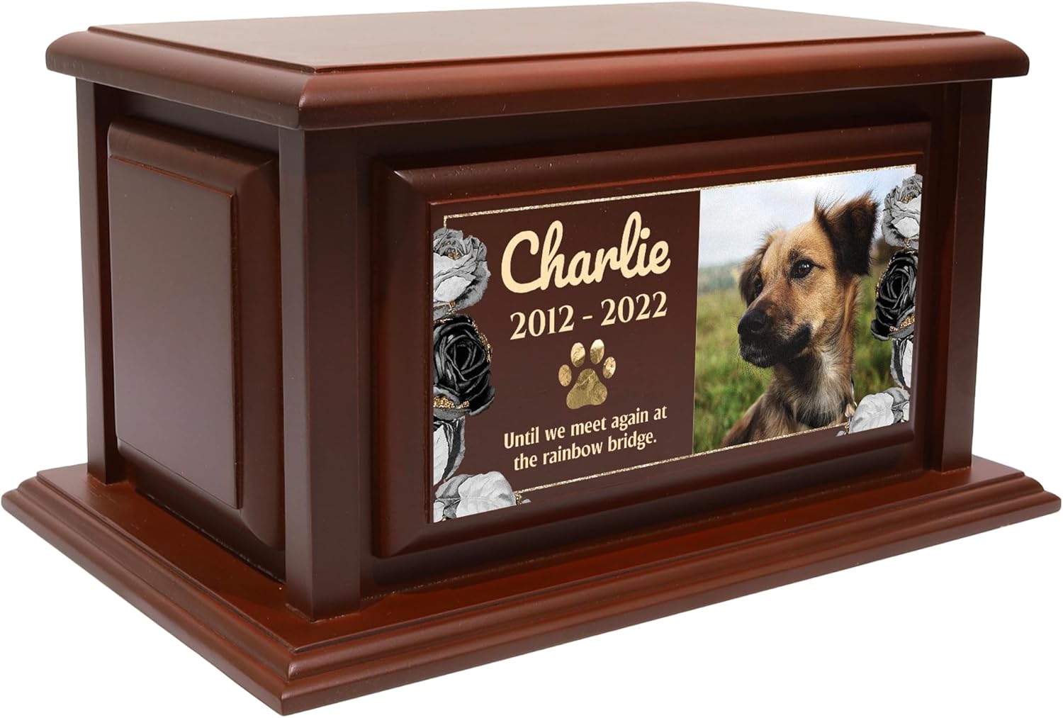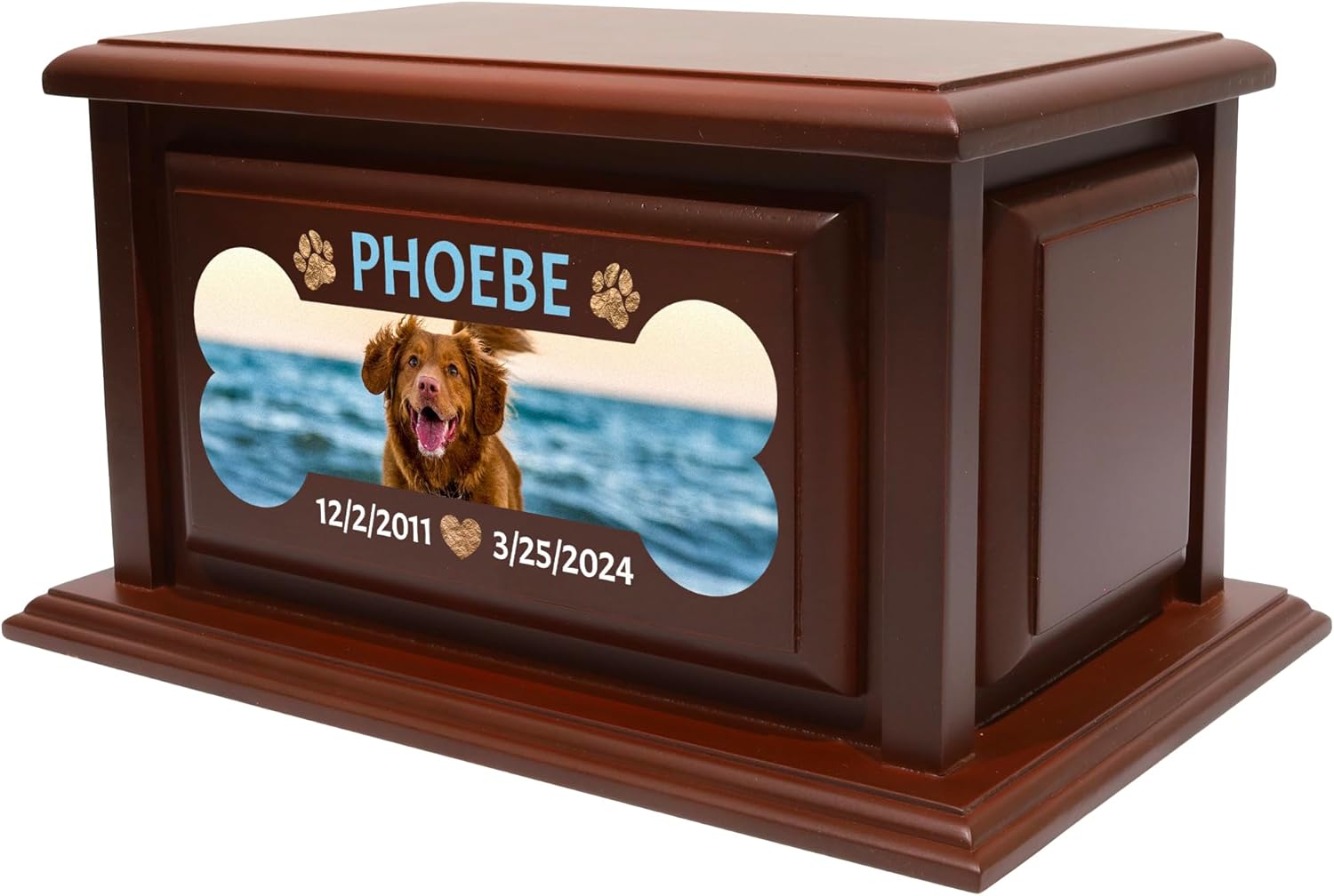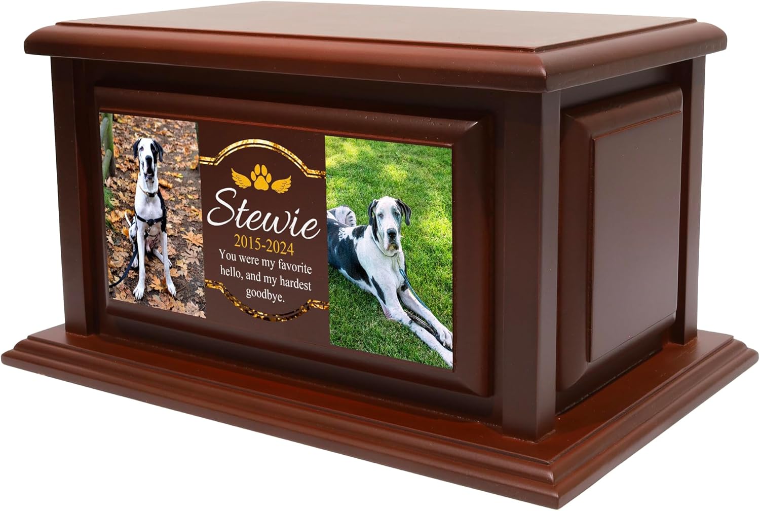 Celebrate your cherished pet's life with our custom pet memorial urns, designed to be a heartfelt tribute. These personalized urns allow you to keep your furry friend's memory alive, offering a way to honor their spirit with a keepsake that reflects the love you shared.You can personalize these urns with your pet's name, a beloved photo, and the dates that mark their time with you, turning them into unique memorials. Each urn becomes more than a resting place for ashes; it's a personal tribute that holds your pet's essence, offering comfort during times of loss.Our urns, measuring 6.5 inches in height, 7.5 inches wide, and 11.5 inches long, with a capacity of 250 cubic inches, are designed to accommodate pets up to 250 lbs. This thoughtful sizing ensures that your pet's memory is honored in a respectful manner.Crafted from high-quality solid pine wood, available in various colors, these urns feature a customizable front cover plate 7.25" L x 3.35" H for adding personal texts and photos. This customization makes the urn a lasting and meaningful tribute to your beloved pet.Presenting one of these personalized urns serves as a compassionate gesture, providing comfort and serving a dignified way to remember your pet. It's a supportive way to show empathy during times of grief.Proudly printed in the USA, our pet urns are made with precision and care, using advanced printing technology and premium materials. Each urn is a testament to love, dedicated to preserving the memory of your pet.Honor your pet's life with our custom memorial urns, a beautiful expression of the bond you shared, crafted to offer solace and celebrate the unique life of your treasured companion.