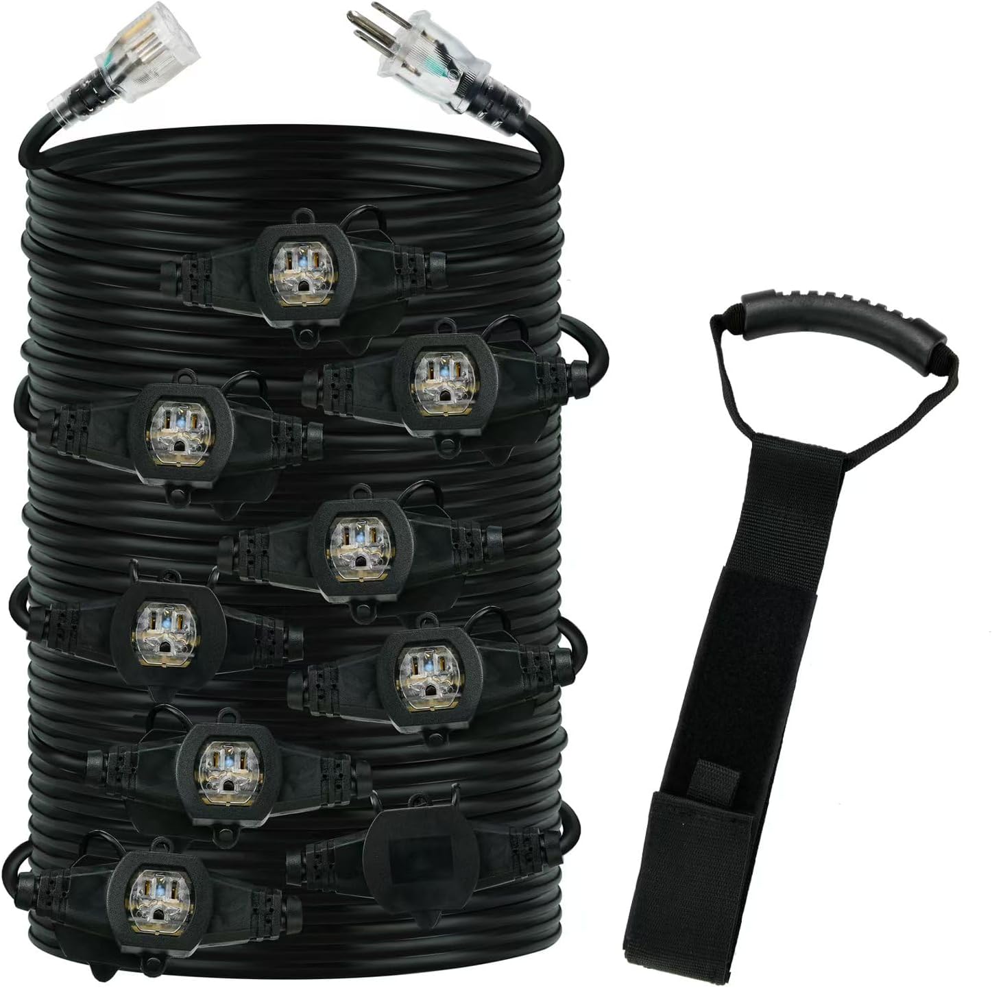 SJTW cord and its meaning: S = Service Cord J = Junior Service Cord (250-300 Volts) T = Thermoplastic constructed jacket W = CSA designation for weather/water resistance for outdoor use Wire: 12 Gauge 105℃ UL LISTED POWER CORD Cords with ETL file number 4000058. 12 gauge cable can run the max wattage of 1875 watts,power of 15 Amp 125 volts. MAXIMIZE THE USAGE OF POWER EXTENSION CABLE,SAY GOODBYE TO THE NORMAL ONES 6 socket in the distance of 5ft,maximize the usage of the power extension strip. WEATHER/WATER/FIRE RESISTANCE The good quality of the SJTW cable 105℃ with the FT-2 level fire resistance.resists moisture, abrasion, and exposure to sunlight,suitable for indoor/outdoor using HEAVY DUTY The big gague and pure copper can avoid the cable getting overheating from long -time use. POWER INDICATOR Blue power indicator is a helpful tool when the cable across the room or in dark places,be carefully there is a socket.there is a cable organizer,allow you to storage the cable effective and easy. 1 YEAR QUALITY GUARANTEE AND 3 YEARS CUSTOMER SERVICE 1 Year warranty,and our friendly customer service professionals are always standing by to help
