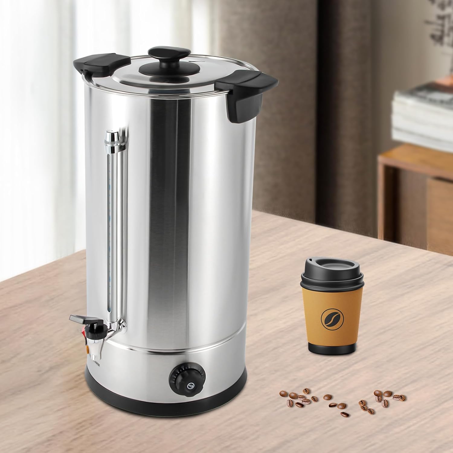 SpecificationsMaterial: 304 Stainless Steel, 201 Stainless Steel, PP, PlasticProcess: BrushedProtection: Anti-dry Burn ProtectionColor: Silver, BlackAdjustable Temperature: 30-110°C/86-230°FVoltage: 110VPlug: US StandardPower: 1.4KWProduct Height: 56.5cm/22.2inBottom Diameter: 26.5cm/10.4inTop Diameter: 34cm/13.4inPacking Size: 33*33*54cm/12.99*12.99*21.25inGross Weight: 5.19kg/11.44lbsNet Weight: 4.39kg/9.67lbsLabel Capacity:25LCapacity:16L (Full Water)Real Capacity :15L (MAX Mark) Package Included1* Coffee Urn1* English User ManualNotesPlease allow the slight color difference caused by the shooting light and 1-3cm error due to manual measurement, and make sure you do not mind before you order.