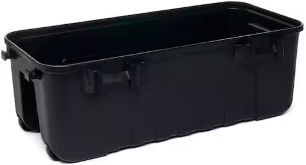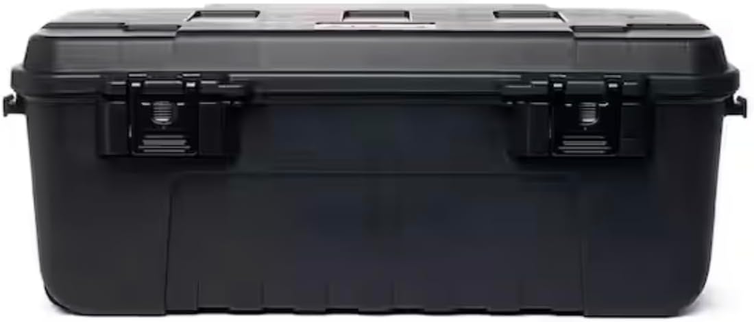 This 27-gallon plastic storage box is ideal for use in the garage, attic, or work shed. Its durable construction features molded grooves for easy stacking and tie-down points on the side for secure transportation. The trunks are lockable and airline-friendly, with integrated, easy-glide wheels for smooth transport. The exterior dimensions are 37.25"L x 18"W x 14"H (94cmL x 46cmW x 36cmH), and the reinforced removable lid is equipped with durable latches for added security.