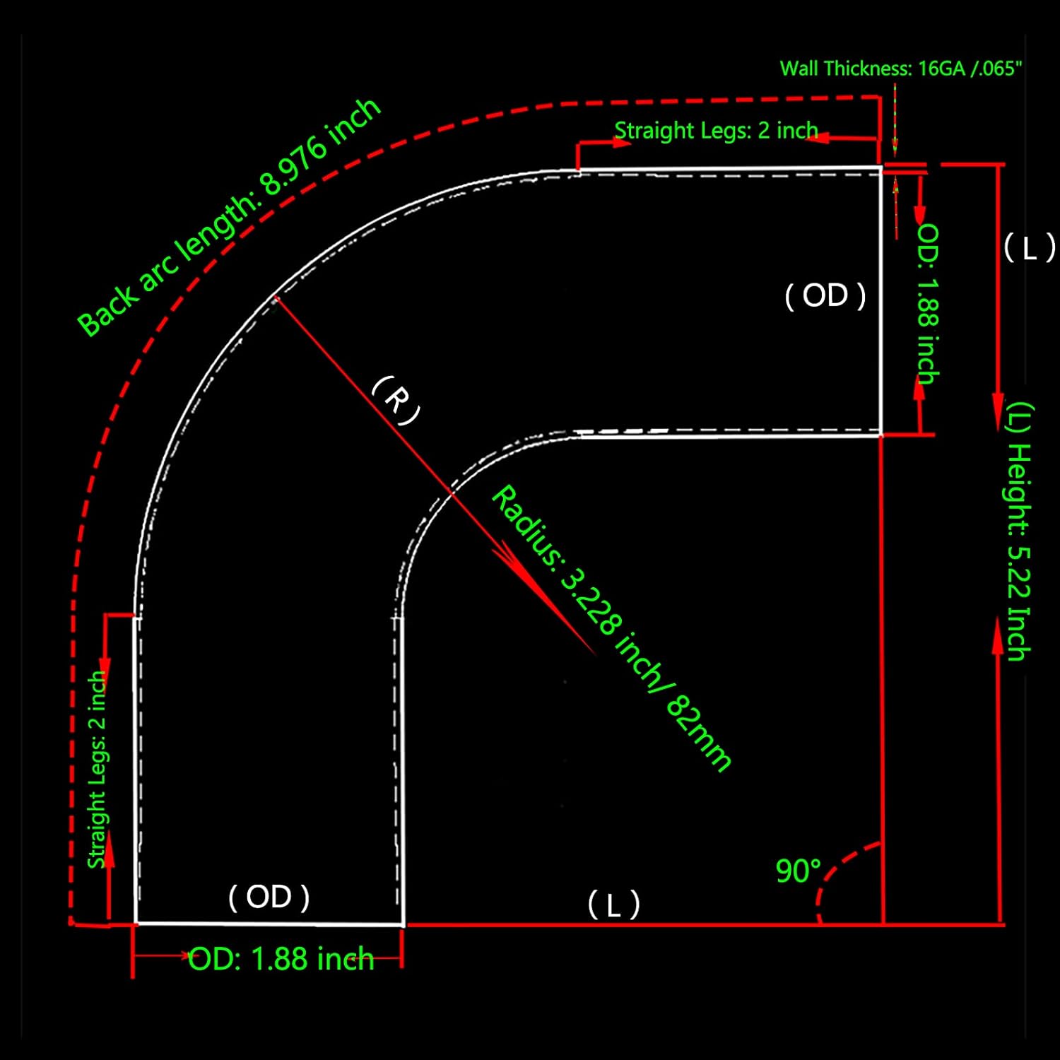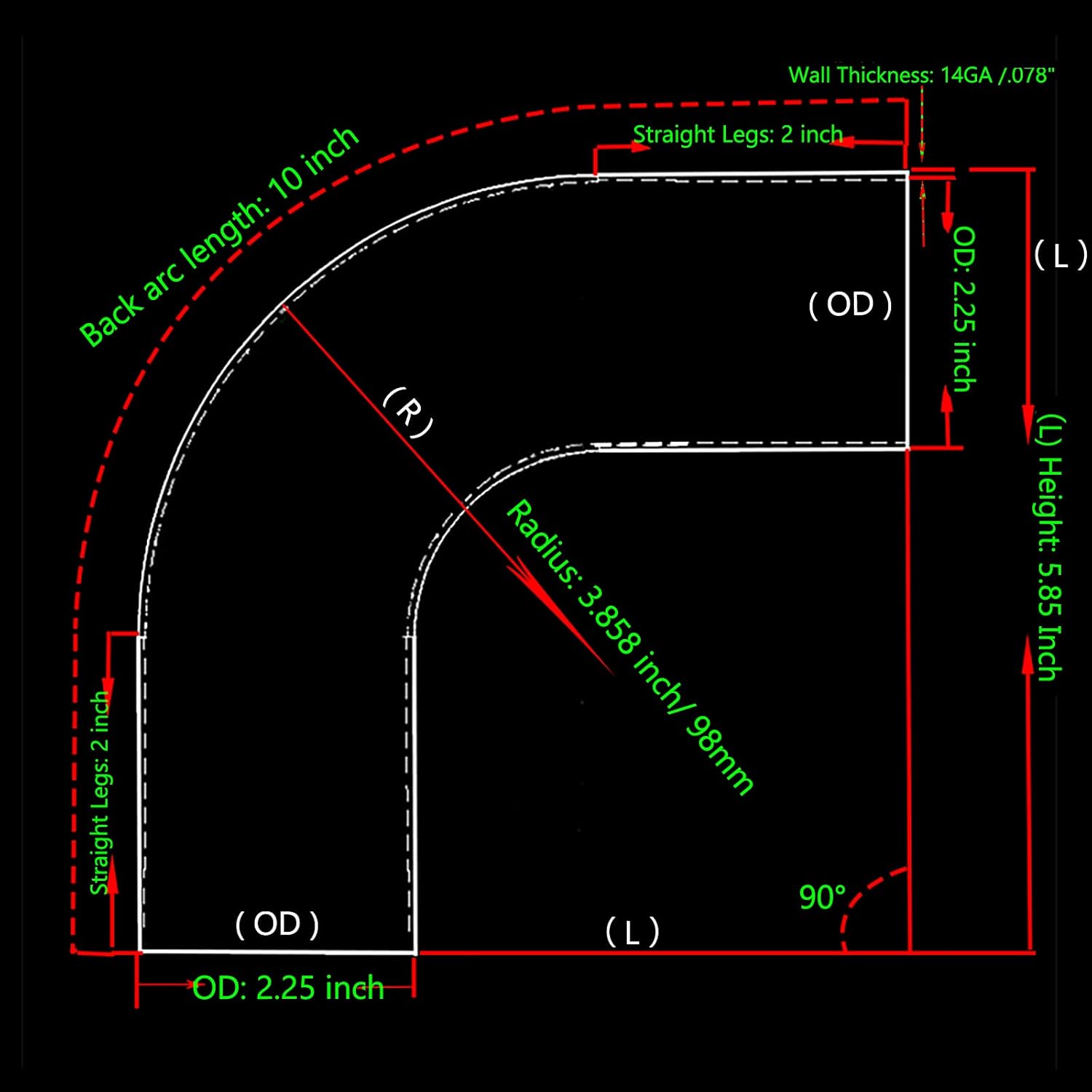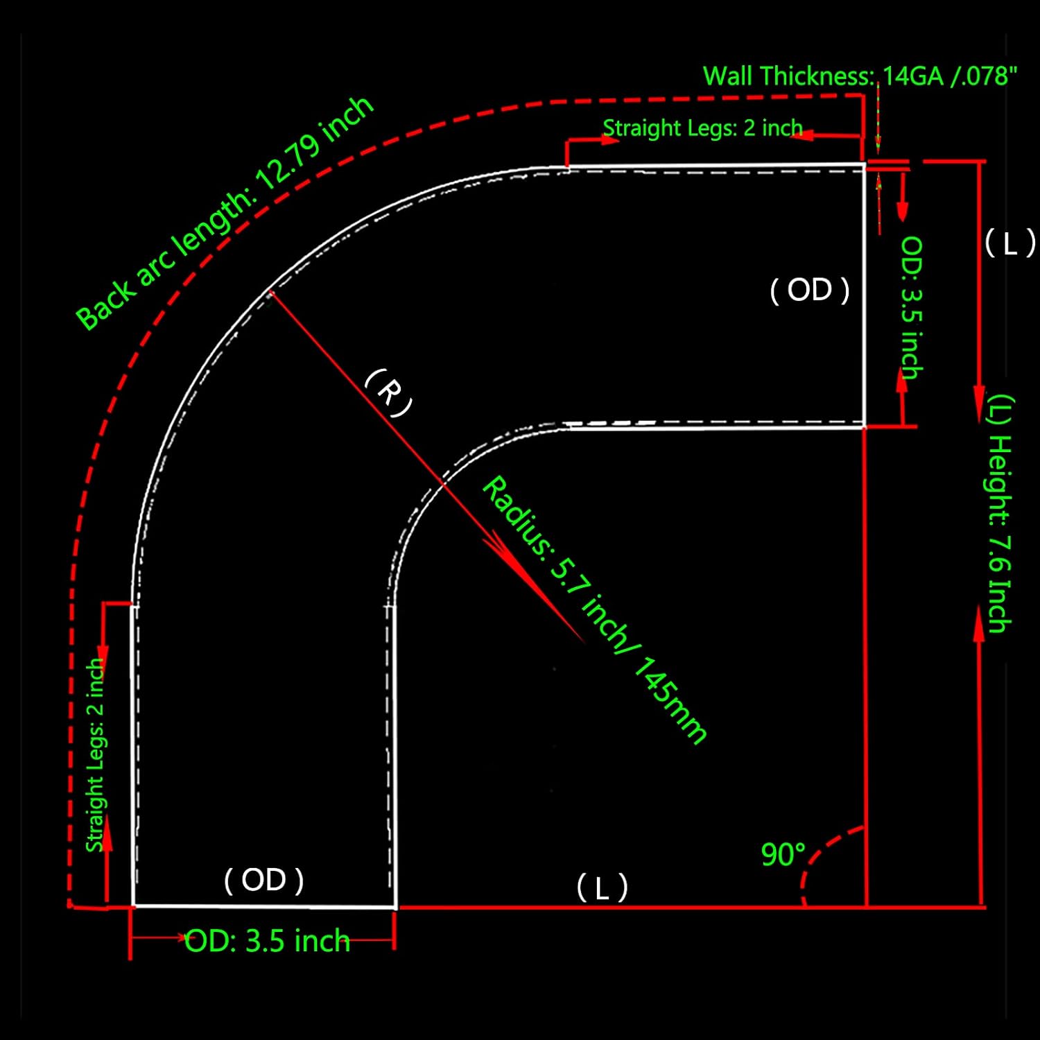 OD: 2.75"(L) Height: 6.45 inch (164mm)(R) Radius: 4.527 inch (115mm)Wall Thickness: 14GA /. 078" (2mm)Back arc length: 10.95 inch (278mm)Straight Legs: 2 inch.KOTVTM SS304 Stainless Steel 90° elbow has a 14GA/. 078" wall thickness. extruded from our 14GA/. 078" 304 Stainless Steel, you wont find a higher quality bend on the market. the ends are laser cut and then they are ultrasonically cleaned to provide a ready to weld solution right out of the package. and potential material waste from bending your own tubing by utilizing our own proprietary cnc extrusion process to provide a perfect bend every time that is wrinkle free. Our Stainless Steel elbows will drastically reduce the fabrication time needed for producing a full Stainless exhaust system when pie cuts become too time consuming.