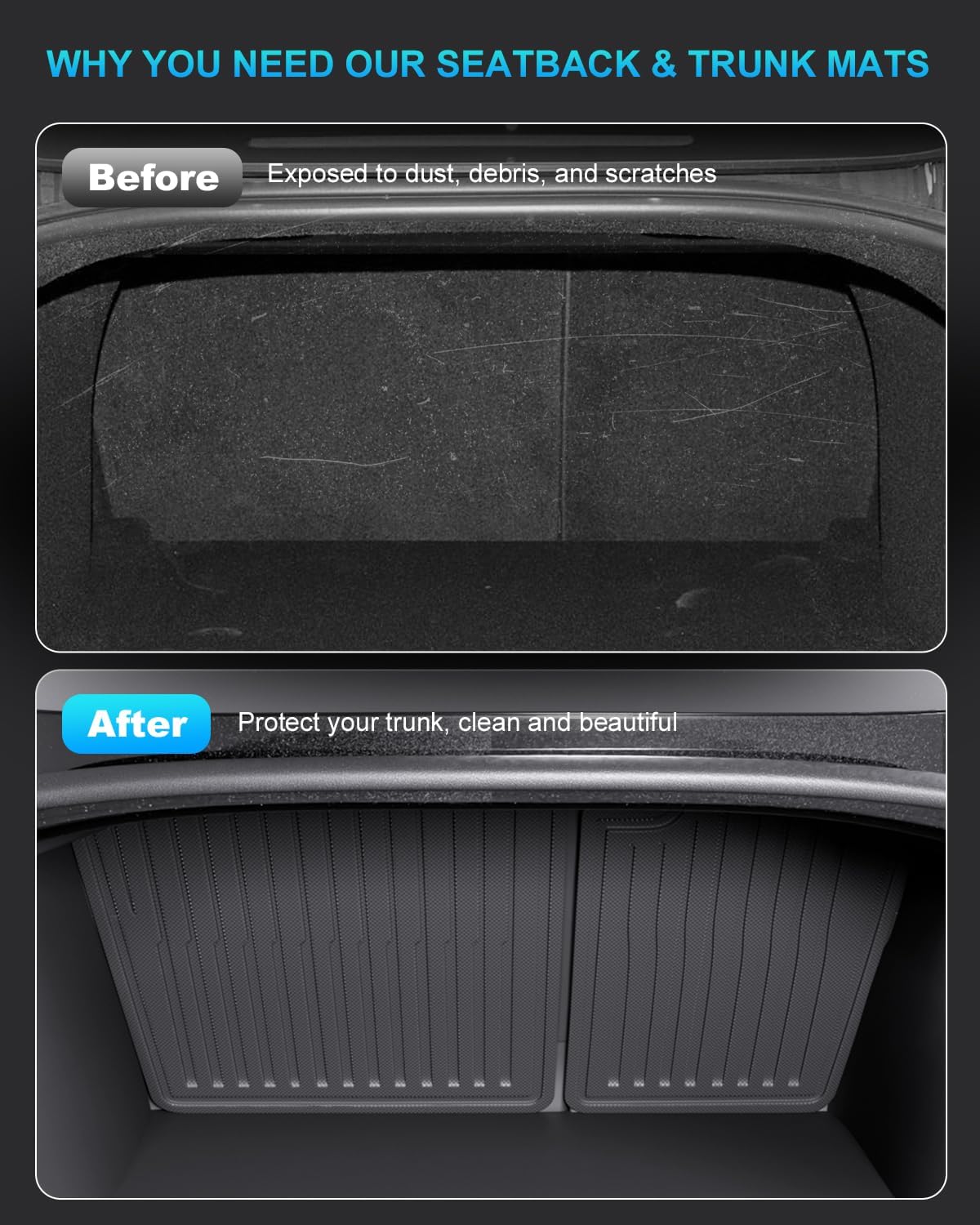 • 【HASSLE-FREE MAINTENANCE】The non-stick surface of the Model 3 seat back protector allows effortless cleaning—simply rinse with water or wipe with a damp cloth. WEKAR TPE trunk mat sets deliver long-lasting durability with easy upkeep.