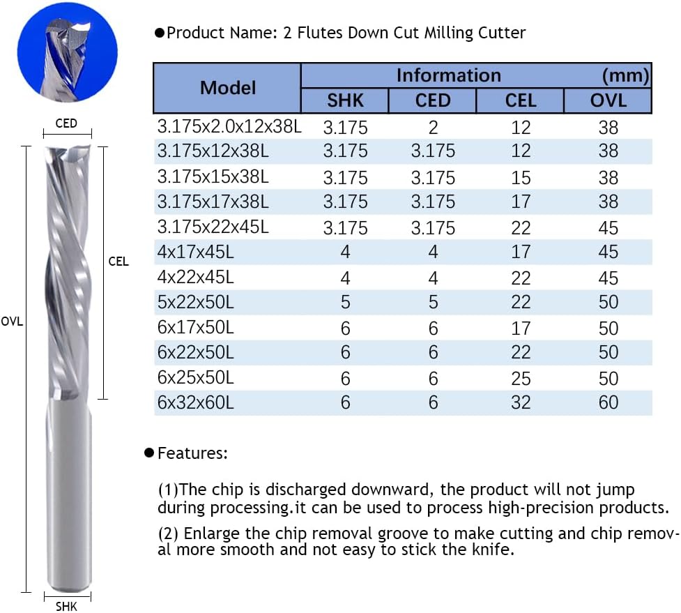 Four Wing Slotting Cutters2pcs Carbide Spiral Router BitsSuitable Materials:Acrylic PVC MDF high-density board lotus board Solid wood wood plastic plate double color sheet Aluminium and etc.Shank Diameter: 3.175 4 5 6mmPackage: 2pcs