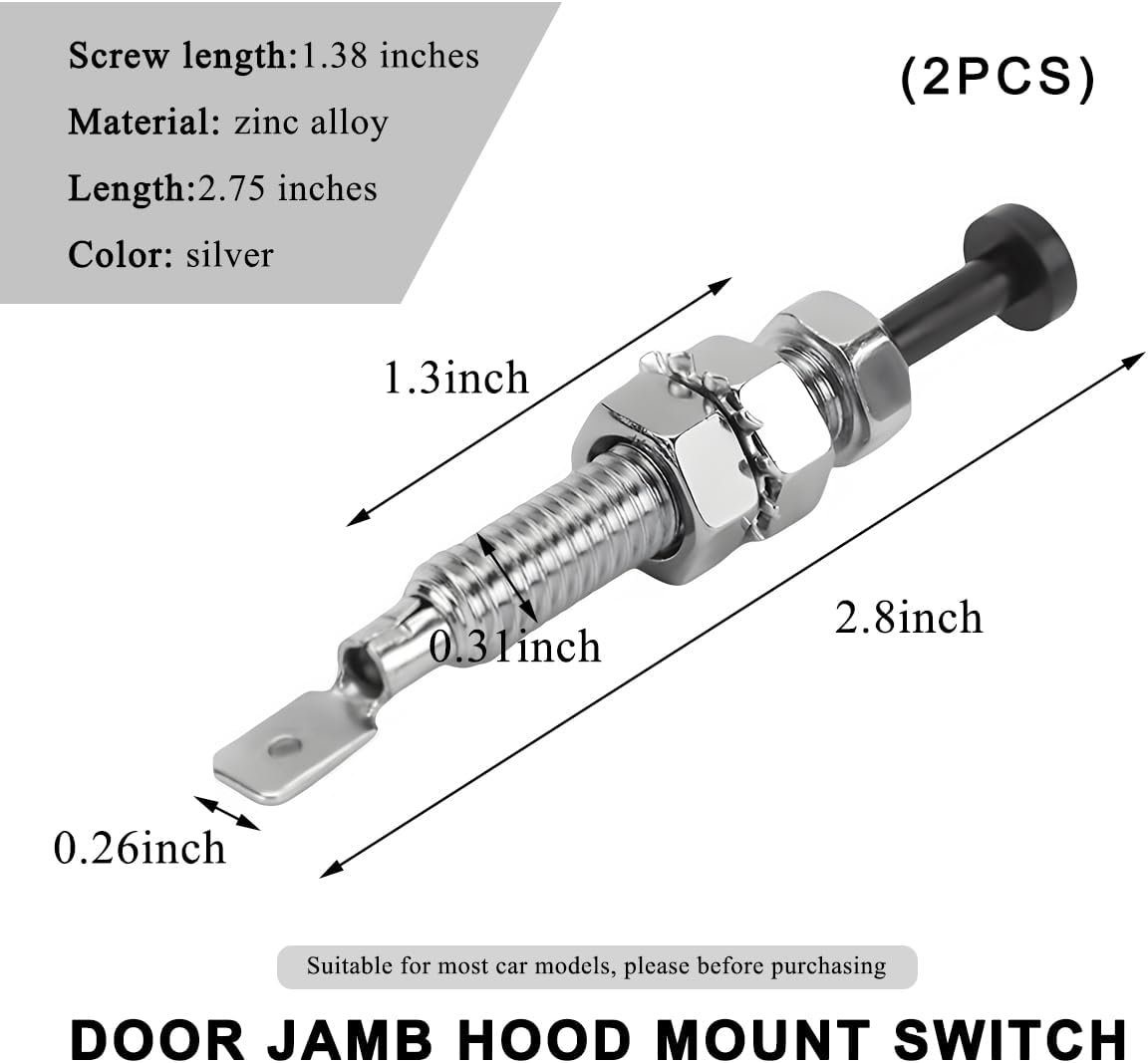 Specification:Material: Nickel-Plated Iron, PlasticQuantity: 2 PCSColor: SilverWeight: 36 gSize: 2.8×0.26 inchesThread Diameter: 0.31 inchesFeature: Sturdy, Rustproof, DurableFit Type: Universal FitMore dvantages of our products:-They are a direct replacement for old or damaged door lock switches, making them easy to install.-These door lock switches are easy to operate, as the push rod can be pressed in and released smoothly.-The precision thread ensures easy screw-in and strong nut retention.