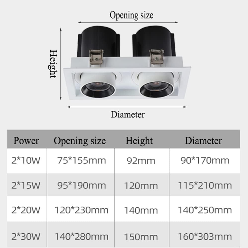 [product information]Product size: (please refer to the size chart)10W*2; diameter: 170*90mm; height: 92mm; opening size: 155*75mm.15W*2; Diameter: 210*115mm; height: 120mm; opening size: 190*95mm.20W*2; Diameter: 250*140mm; height: 140mm; opening size: 230*120mm.30W*2; Diameter: 303*160mm; height: 150mm; opening size: 280*140mm.Size conversion: 1 mm = 0.039 inches.Material: aluminum.Color: white. (As shown in the figure).Light source: LED chip.Color temperature: 2700K/3000K/3500K/4000K/5000K/6000K.Color rendering index: 90+.Life life: 50,000 hours.Power: 10W*2/15W*2/20W*2/30W*2.Voltage: 90-260V.Applicable space: bar, restaurant, kitchen, study, living room, bedroom, bar, cafe, etc.Packing list: 2*downlight (Figure 1).