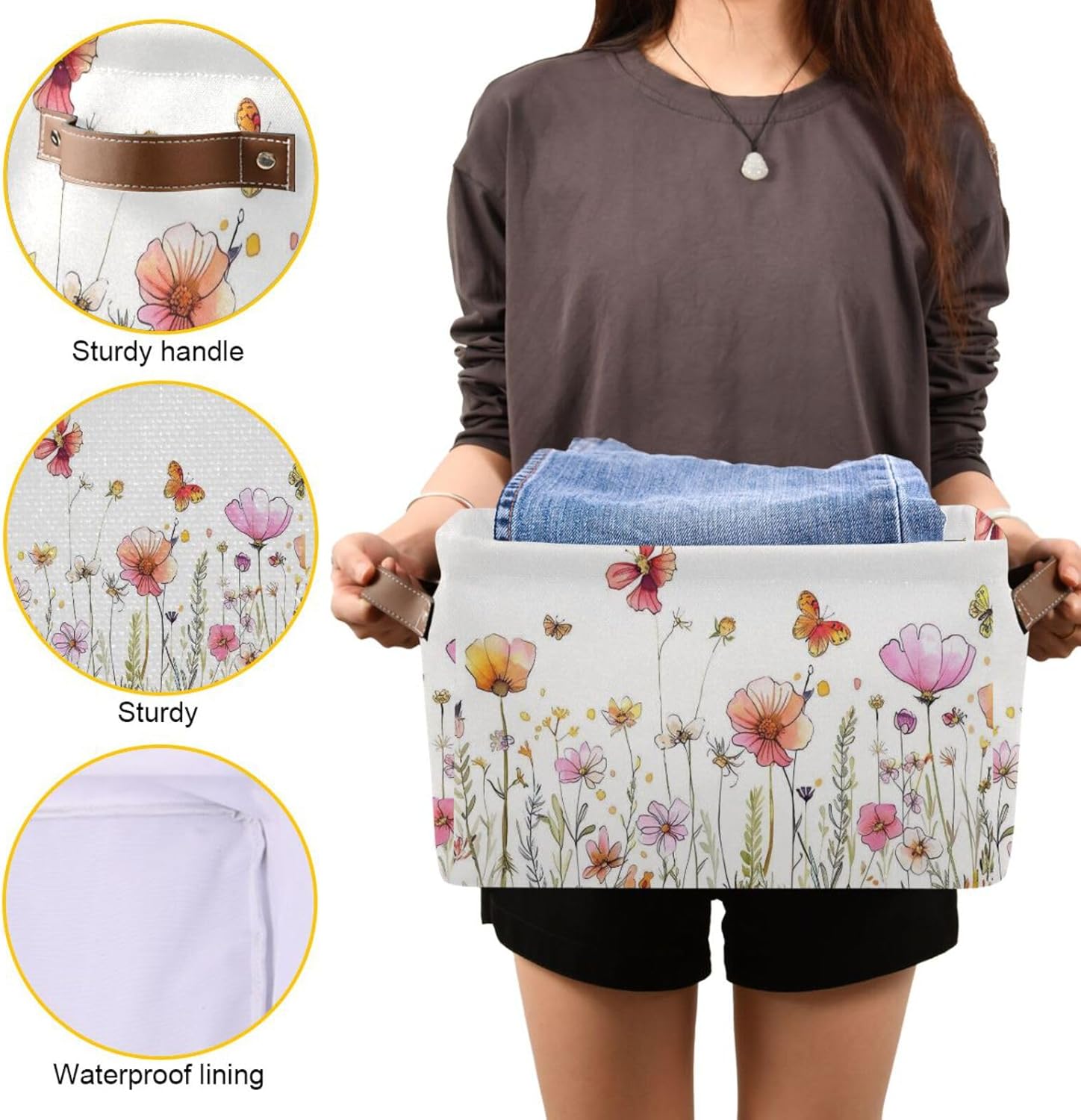 2PCS Flowers Butterfly Large Collapsible Storage Bins,Canvas Fabric Foldable Storage Bins with Handles Open Home Storage Bins Boxes Toy Storage Basket