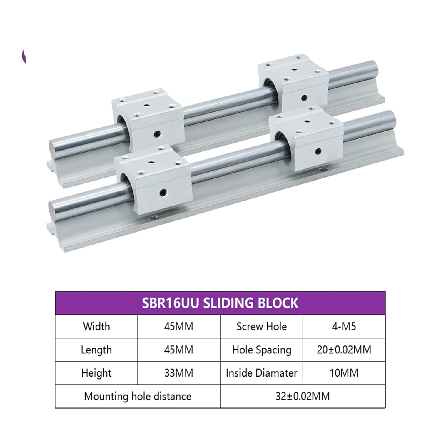 Cross Roller GuidesModel Number : SBR16Guide Width or Diameter : 16mm Type : SBR Linear Slide Rail SetSupport Material : AluminumRound Shaft : Bearing SteelQuantity : 2pcs SBR Guide Rails+4pcs Blocks