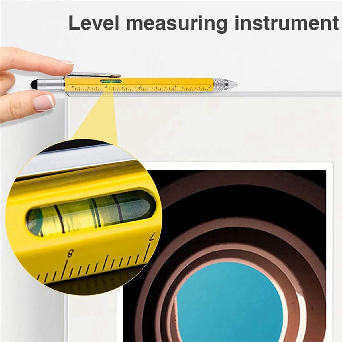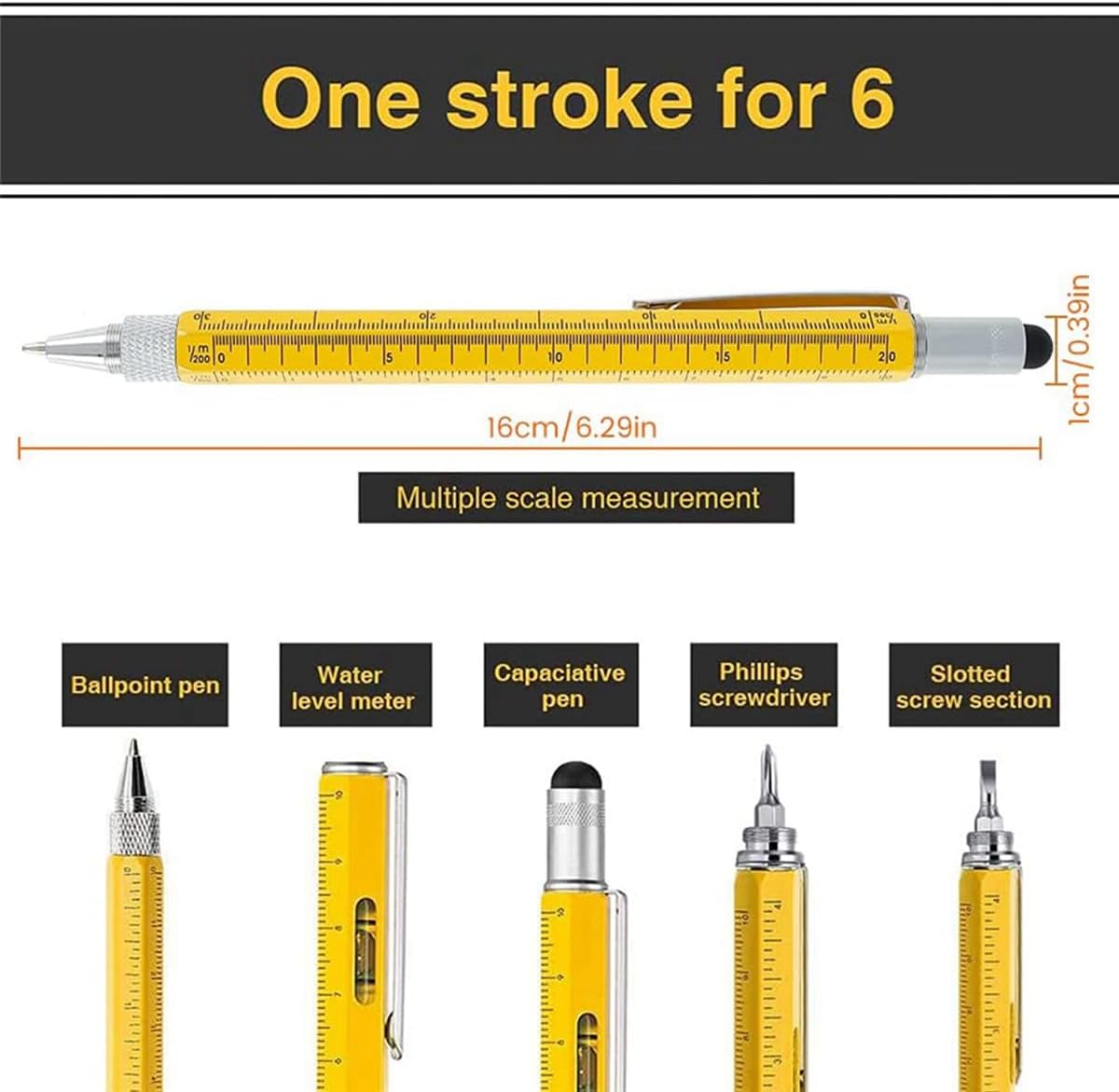 [All in One Multi Tool Pen]: This unique tech gadget tool pen combines ruler, ballpoint pen, stylus, spirit level, flat head, Phillips screwdriver, 6 in 1 design, perfect for men,dad working and gifts.[4 Scales + 3 Refills]: the multi tool pen is not only a ruler with 4 scales, but also a ballpoint pen with 3 refills, which greatly meets the requirements for scales in drawing work and can also solve the use of ballpoint pens, no need to worry about running out of ink.[Multi Stylus]: This multi tool stylus pens can compatible with all touch screen smart device,such as tablets and smart phones.It can also as the cap of a ballpoint pen and effectively avoid the accident of ink leakage by accident.The stylus pen can also of using phone with wet or dirty hands outdoors.[Personalized Design]: This tool pen built-in spirit level, no need to worry about repetitive work due to uneven photos or drawings.It is also equipped with a flat head and a Phillips screwdriver,it is good for you to remove equipment screws indoors or outdoors.[Gifts for Men]: This is a great gift for family and friends. This is a perfect gift for and versatile gadget lovers.Colour:yellowMaterial:MetalPackage includes:2 x pen6 x refillsOnly the above package content, other products are not included.Note: Light reflection and different displays may cause the color of the item in the picture a little different from the real thing. The measurement allowed error is +/- 1-3cm.Item specifics:Origin: Mainland China