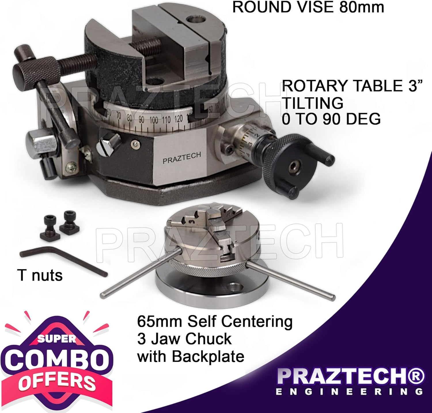 Upgrade your machining precision with this 3" (80mm) Tilting Rotary Table Set, designed for small milling machines, mini mills, and precision indexing applications. Built from durable alloy steel and engineered for accuracy, this low-profile rotary table delivers smooth rotation and reliable positioning for complex machining tasks. Featuring a 36:1 worm gear ratio, each full rotation of the handle moves the table by exactly 10 degrees, allowing precise control for drilling, cutting, and indexing operations. The table tilts from 0° to 90°, making it ideal for angled work and multi-axis setups. This complete set includes a 65mm 3-jaw self-centering chuck, a compatible back plate with M14 x 1 mounting thread, a round vise, and T-nuts for secure mounting. The 4-slot design ensures flexibility for different setups, while the included accessories make it a ready-to-use solution right out of the box. Perfect for hobbyists, machinists, tool rooms, and small workshop environments, this rotary table combo delivers professional-grade performance in a compact size.