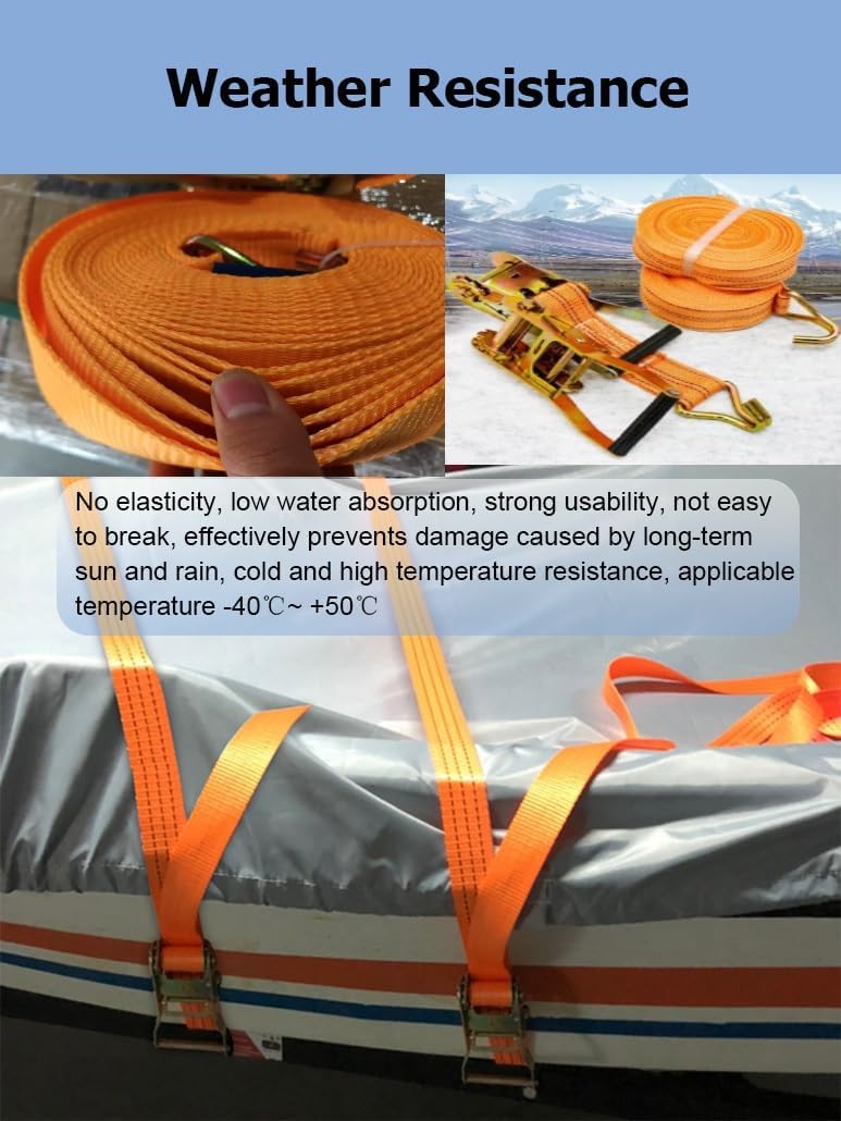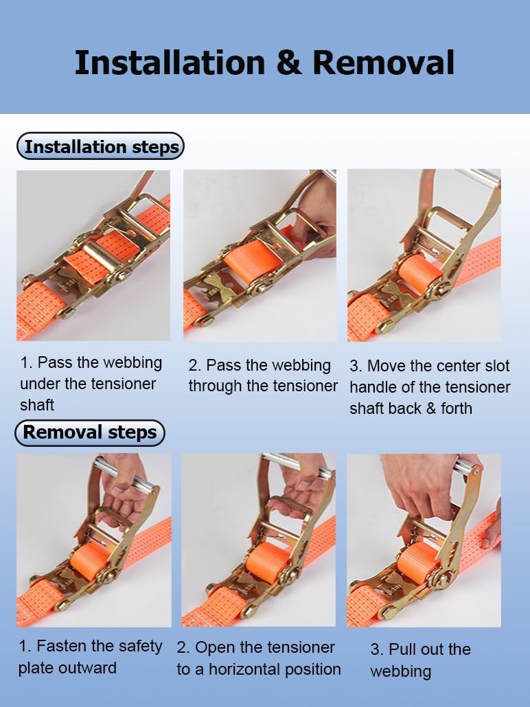 Are you still worried about cargo falling off easily?Heavy duty ratchet straps with steel hooks, tie down straps can be widely used to secure cargo for moving and securing equipment, motorcycles, trucks, vans, kayaks, warehouses, etc.Specifications: Name: Polyester Tie Down StrapsMaterial: Polyester Straps + Steel Frame + Aluminum HandleWidth: 7.5 cm / 3.0 inLength: 2.0 m / 6.6 Ft , 3.0 m / 9.8 Ft , 4.0 m / 13.1 Ft , 5.0 m / 16.4 Ft , 6.0 m / 19.7 Ft , 8.0 m / 26.2 Ft , 10.0 m / 32.8 Ft , 12.0 m / 39.4 Ft , 15.0 m / 49.2 Ft , 18.0 cm / 59.1 Ft, 20.0 m / 65.6 FtApplication: Bundling goods /fixing goods, etc.Features:1. High-density cargo straps are wear-resistant and break-resistant2. Cargo straps are easy to use, not easy to fall off and can be fixed immediately3. Truck straps have an easy-release mechanism to easily release the tension on the straps4. Ratchet straps have double-stitched edges to prevent slipping during use; ensure that the cargo is firmly fixed in place, giving you peace of mind when transporting cargo; reinforced stitching adds extra strength and stability to the straps5. Lashing strap are equipped with double J-hooks for easy fixation6. Tow strap have strong pulling force, 10 tons / 22046 lbs7. Tie down straps are widely used, including moving, securing cargo, camping or other tie-down needs, such as warehouses, motorcycles, canoes, kayaks, ATVs, trucks, boxes, furniture, lawn equipment, etcPackage Included:1 x Heavy Duty Ratchet Strap with HookTighten Ratchet Straps Steps:1. Pass the strap under the tensioner rotating shaft2. Pass the strap through the center slot of the tensioner rotating shaft3. Pull the tensioner handle back and forthRelease Ratchet Straps Steps:1. Fasten the safety plate outwards2. Open the tensioner to level3. Pull out the strapNotes:1. Due to manual measurement, there may be a 1-2 cm error, please understand2. Due to different monitors, there may be color differences, please refer to the actual product3. Do not use as a vehicle tow rope, car towing needs to be more load-bearing rope