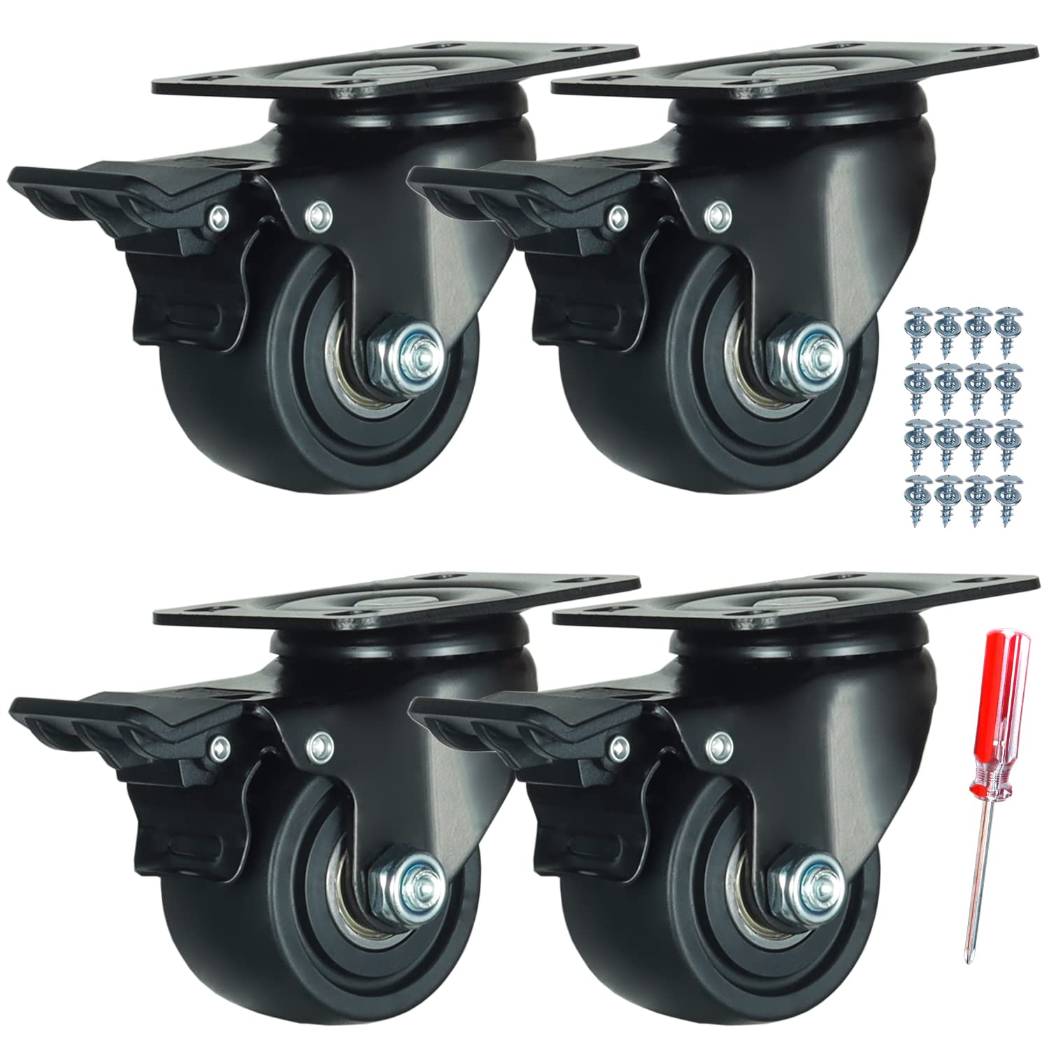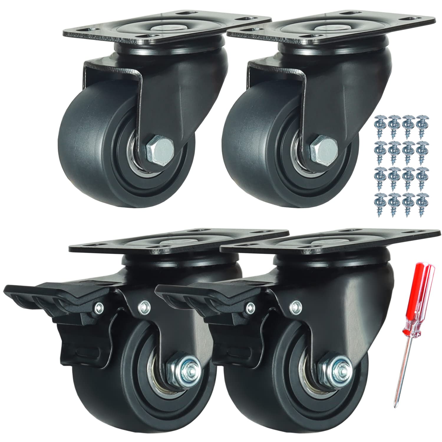 75mm Heavy Duty Plate Swivel Casters Wheels Trolley Furniture Casters Why choose our DICASAL? DICASAL established in Feb, 2016, as a professional casters manufacturer, we are committed to providing our customers with high grade solutions, we use advanced equipment, and the latest technology for ensuring the longer life and flexibility of casters. Specifications: Brand Name: DICASAL Wheel Type: Swivel Plate Casters Wheel Size: 3 inches/75mm Wheel Color: Black Material: Nylon Wheels and Carbon Steel Load bearing: 300KGS (each) Total Load Capacity: 900 KGS/ 2000 LBS(Counting of 3) Wheel Type : 75mm black nylon, dual roller bearing Applicable industry: Automobile, mechanical industries, shipment carts etc. Dimension Details: Overall Height: 105mm/4.134 inch Overall Length: 124.5mm/4.902 inch Wheel Diameter: 75mm/2.953 inch Wheel Width: 45mm/1.772 inch Fixing Plate Size: 105x80mm/4.134x3.15 inch Hole Diameter: 10.75x8.75mm/0.423x0.344 inch Installment Holes spacing: 83x60mm/3.268X2.362 inch Features: Black nylon wheel tire Double ball bearing swivel head Directional wheel Superior mechanical Quiet, Wear-resisting Shock absorption Would not scratch the floor Ideal for various uses and place Package Included: 2x Double Ball Bearing Swivel Casters with Brakes and 2 without 16x TA6x30 Screws 1x Screwdriver.