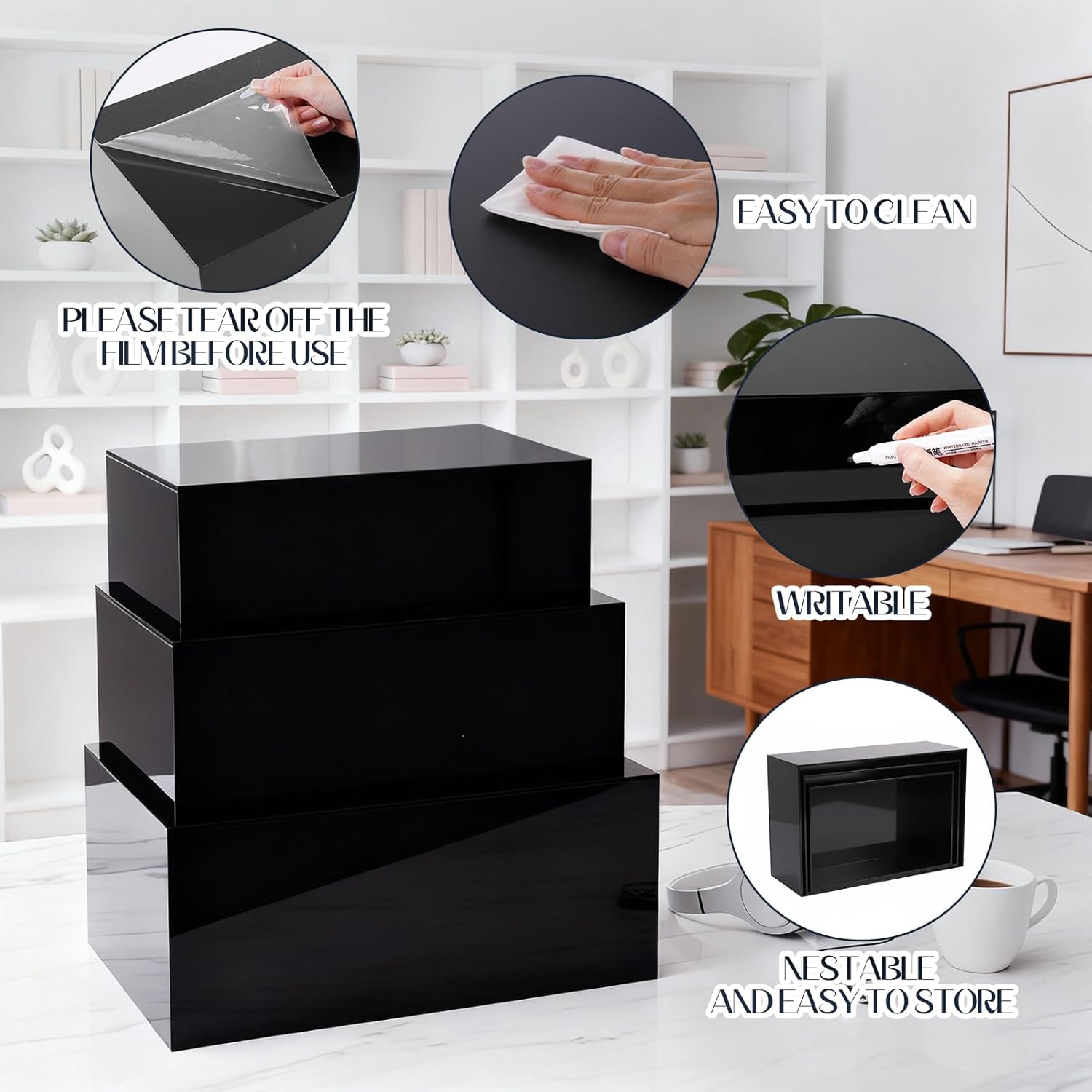 Feature: Large acrylic risers for display: Elevate your presentation with our extra large acrylic risers, featuring a set of three chic and versatile display stands. Crafted from quality acrylic that is both durable and stylish, these risers are the ideal solution for showcasing a variety of items. Their design is not only visually stunning but also functional, providing a stable platform for your valuables. Whether utilizing them as food risers for buffet tables, cake stands for formal events, or sophisticated displays for jewelry and collectibles, these hollow-bottomed risers make an impeccable addition to any setting. Expand your display options with our elegantly constructed acrylic risers display cubes, perfect for showcasing items in a manner that is both aesthetically pleasing and efficient. Their lightweight yet durable build ensures ease of transport and setup, making them an essential tool for caterers, retailers, and collectors alike. Basic information: Quantity: 3 Color: black Material: acrylic Thickness: 0.16 inch / 0.4 cm Size detail: Large: 15 x 10 x 6 inch / 38.1 x 25.4 x 15.24 cm Medium: 14 x 9 x 5 inch / 35.56 x 22.86 x 12.7 cm Small: 13 x 8 x 4 inch / 33.02 x 20.32 x 10.16 cm Package included: 3 x Large black acrylic risers Warm note: Please tear off the protective film on the surface of the risers display stands before use to experience the better display effect. Manual measurement, there may be slight differences in size. Due to the screen display, the color of the item may differ slightly from the picture