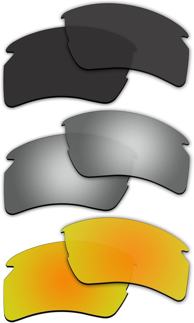 3 Pair Lenses - Black | Titanium Mirror Coating | Gold Mirror CoatingFeatures1. Made of premium quality which offers 100% UV Protection & 100% Polarized 2. Precision Cut and Guaranteed to fit with the original Oakley Flak 2.0 XL frame extremely seamless 3. Mirror Coatings optimize usable light for specific environment and activities 4. Easy to install 5. Reduces glare and enhances contrast perfectly 6. Comes with fibre cleaning cloth and compatible size of hard protection case Not include the FrameDisclaimer: Our lenses are not affiliated with Oakley in any aspects.This Lenses Fit Oakley Model?Flak Jacket (Not Fit) Flak Jacket XLJ (Not Fit) Flak 2.0 (Not Fit) Flak 2.0 XL (Fit)Make sure the oakley model and lenses is the right one you need. If you are not sure, please search the SKU # which is marked on your frame.Fit SKU: OO9188