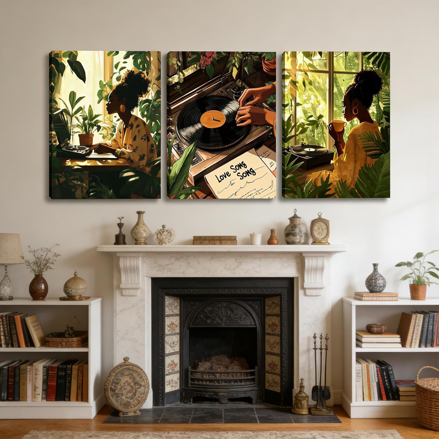 3 PCS Black Girl Canvas Wall Art African American Painting Poster Green Music Wall Decor Black Women Pictures for Living Room Bathroom Bedroom Home Decoration 16*24 in ( Stretched Canvas on A Wooden Frame)
