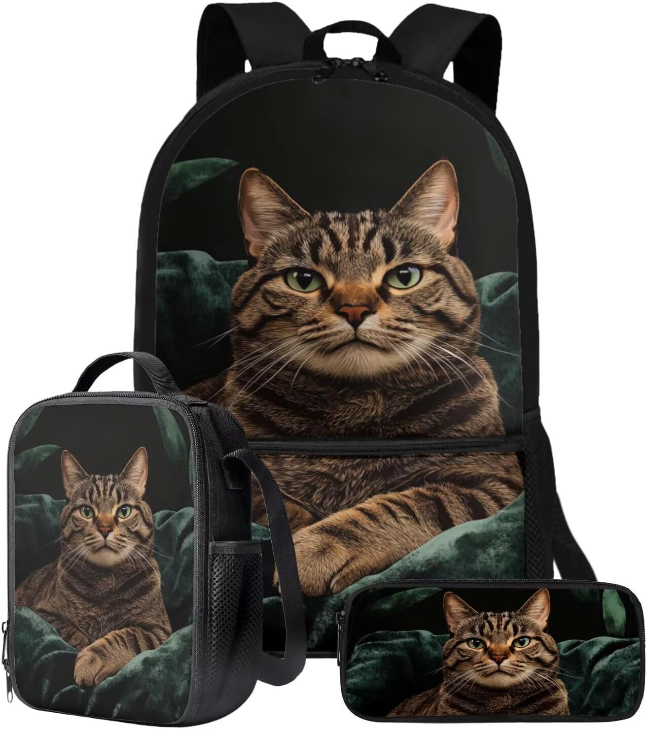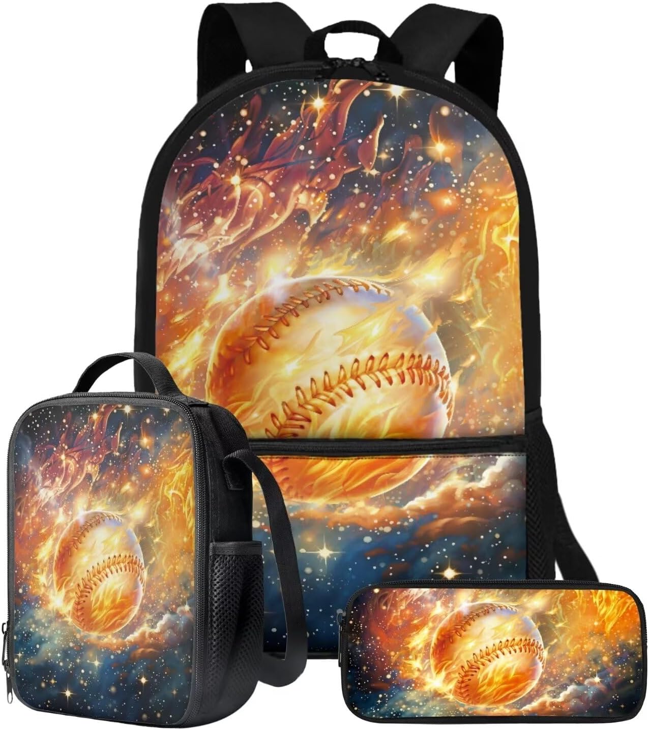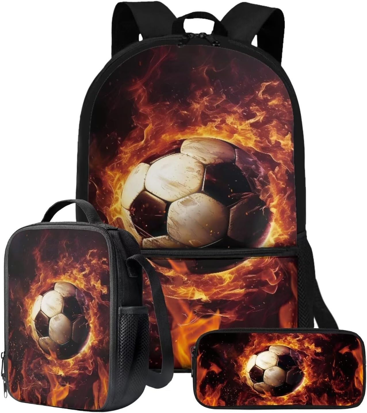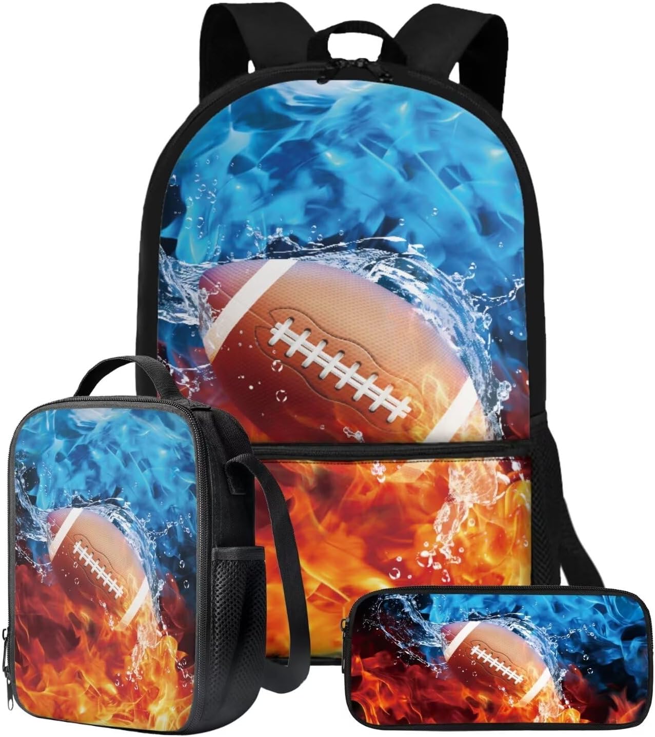 The School Backpack is crafted from high-quality polyester material, prioritizing both comfort and durability. With its spacious main zipper pocket, front zipper pocket, and two side mesh pockets, this backpack offers ample storage space for books, binders, daily essentials, water cups, umbrellas, and more. Its dimensions of 28cm length, 13cm width, and 44cm height make it ideal for carrying all your necessities.The Lunch Bag is designed with practicality in mind. Its polyester exterior and EVA+PE cotton lining maintain the freshness and warmth of your food for hours. The double zipper design allows for easy access, and the mesh bottle pocket and internal elastic straps keep your utensils organized. With dimensions of 19cm length, 8cm width, and 24cm height, this lunch bag is perfect for on-the-go meals, picnics, road trips, and lunchtime at the office or school.The Pencil Bag, made of durable polyester material, features a single pocket with a zipper closure. It serves as a versatile organizer for pens, pencils, stationery, makeup, or tools. Whether you're a student, professional, or artist, this pencil bag is a practical choice. With dimensions of 22cm length, 4.5cm width, and 11cm height, it provides ample space for your essentials.Choose from a variety of stylish patterns such as sports, flowers, Boho, animals, tie dye, butterfly, and elephants. These eye-catching designs make our backpack set an excellent gift option for teenagers, kids, boys, and girls. Whether you're heading to school, going shopping, embarking on a date, traveling, or camping, these bags are versatile companions suitable for various occasions.Experience the perfect blend of functionality and style with our 3-Piece Backpack Set.
