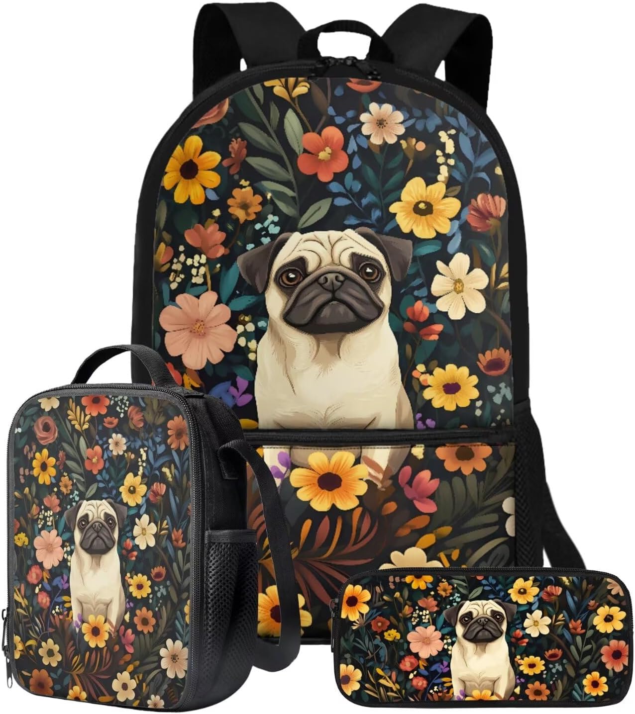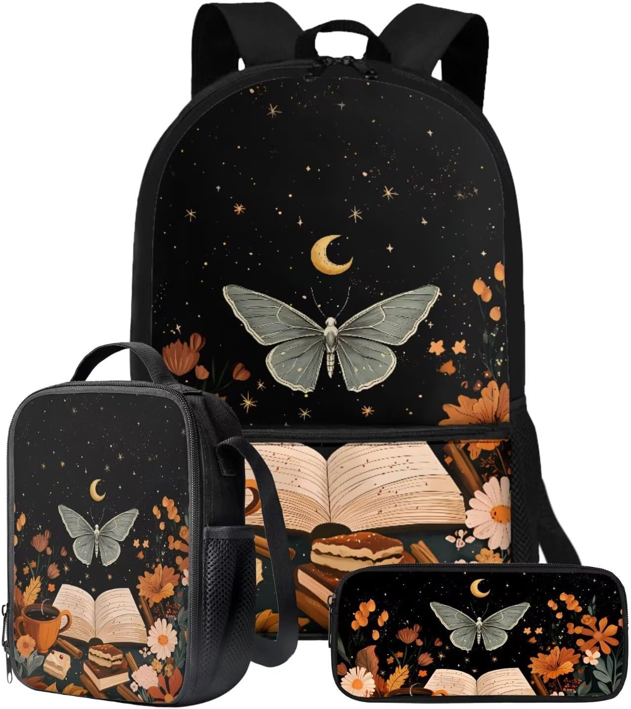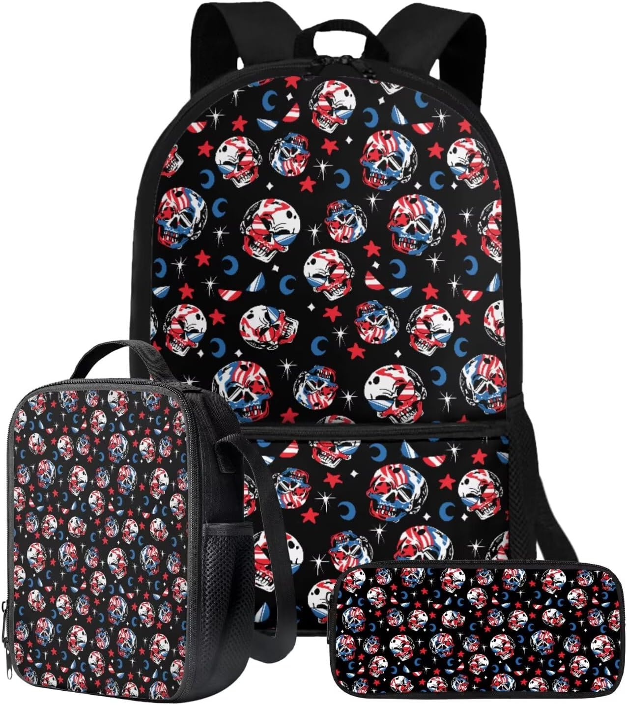 The School Backpack is crafted from high-quality polyester material, prioritizing both comfort and durability. With its spacious main zipper pocket, front zipper pocket, and two side mesh pockets, this backpack offers ample storage space for books, binders, daily essentials, water cups, umbrellas, and more. Its dimensions of 28cm length, 13cm width, and 44cm height make it ideal for carrying all your necessities.The Lunch Bag is designed with practicality in mind. Its polyester exterior and EVA+PE cotton lining maintain the freshness and warmth of your food for hours. The double zipper design allows for easy access, and the mesh bottle pocket and internal elastic straps keep your utensils organized. With dimensions of 19cm length, 8cm width, and 24cm height, this lunch bag is perfect for on-the-go meals, picnics, road trips, and lunchtime at the office or school.The Pencil Bag, made of durable polyester material, features a single pocket with a zipper closure. It serves as a versatile organizer for pens, pencils, stationery, makeup, or tools. Whether you're a student, professional, or artist, this pencil bag is a practical choice. With dimensions of 22cm length, 4.5cm width, and 11cm height, it provides ample space for your essentials.Choose from a variety of stylish patterns such as sports, flowers, Boho, animals, tie dye, butterfly, and elephants. These eye-catching designs make our backpack set an excellent gift option for teenagers, kids, boys, and girls. Whether you're heading to school, going shopping, embarking on a date, traveling, or camping, these bags are versatile companions suitable for various occasions.Experience the perfect blend of functionality and style with our 3-Piece Backpack Set.
