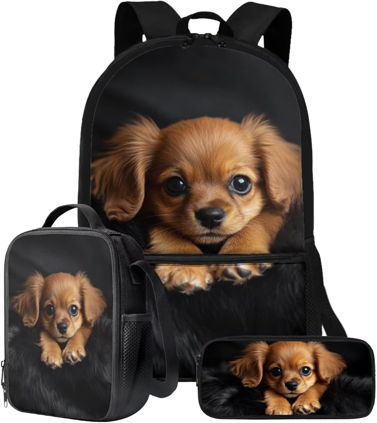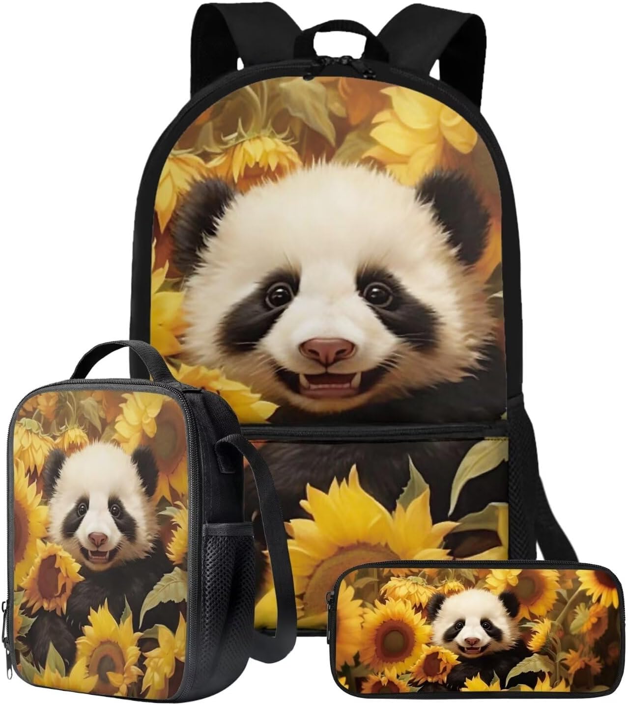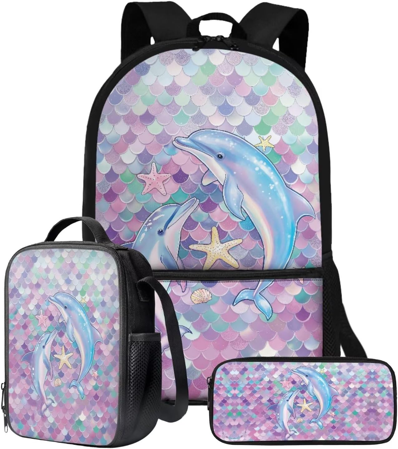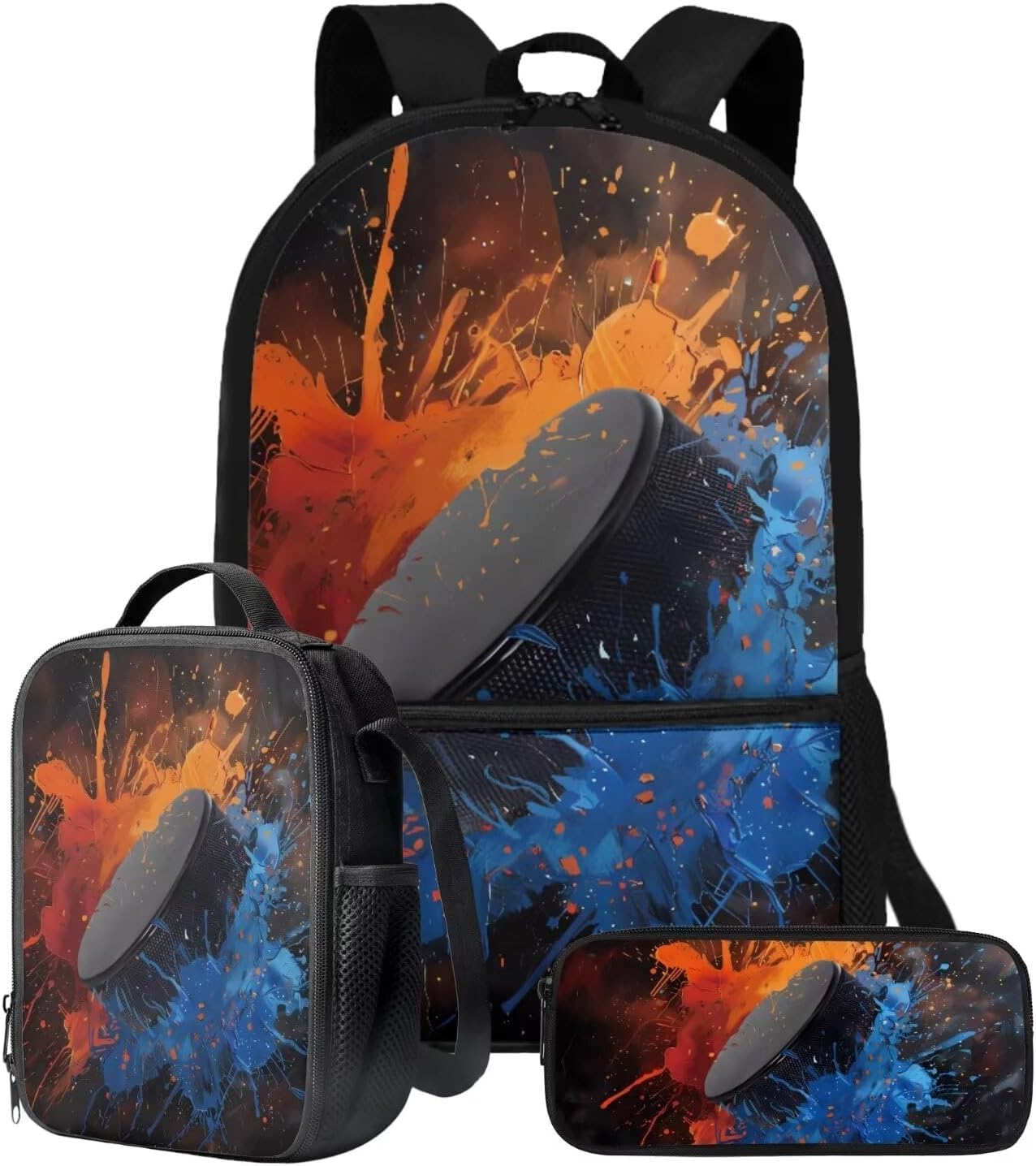 The School Backpack is crafted from high-quality polyester material, prioritizing both comfort and durability. With its spacious main zipper pocket, front zipper pocket, and two side mesh pockets, this backpack offers ample storage space for books, binders, daily essentials, water cups, umbrellas, and more. Its dimensions of 28cm length, 13cm width, and 44cm height make it ideal for carrying all your necessities.The Lunch Bag is designed with practicality in mind. Its polyester exterior and EVA+PE cotton lining maintain the freshness and warmth of your food for hours. The double zipper design allows for easy access, and the mesh bottle pocket and internal elastic straps keep your utensils organized. With dimensions of 19cm length, 8cm width, and 24cm height, this lunch bag is perfect for on-the-go meals, picnics, road trips, and lunchtime at the office or school.The Pencil Bag, made of durable polyester material, features a single pocket with a zipper closure. It serves as a versatile organizer for pens, pencils, stationery, makeup, or tools. Whether you're a student, professional, or artist, this pencil bag is a practical choice. With dimensions of 22cm length, 4.5cm width, and 11cm height, it provides ample space for your essentials.Choose from a variety of stylish patterns such as sports, flowers, Boho, animals, tie dye, butterfly, and elephants. These eye-catching designs make our backpack set an excellent gift option for teenagers, kids, boys, and girls. Whether you're heading to school, going shopping, embarking on a date, traveling, or camping, these bags are versatile companions suitable for various occasions.Experience the perfect blend of functionality and style with our 3-Piece Backpack Set.