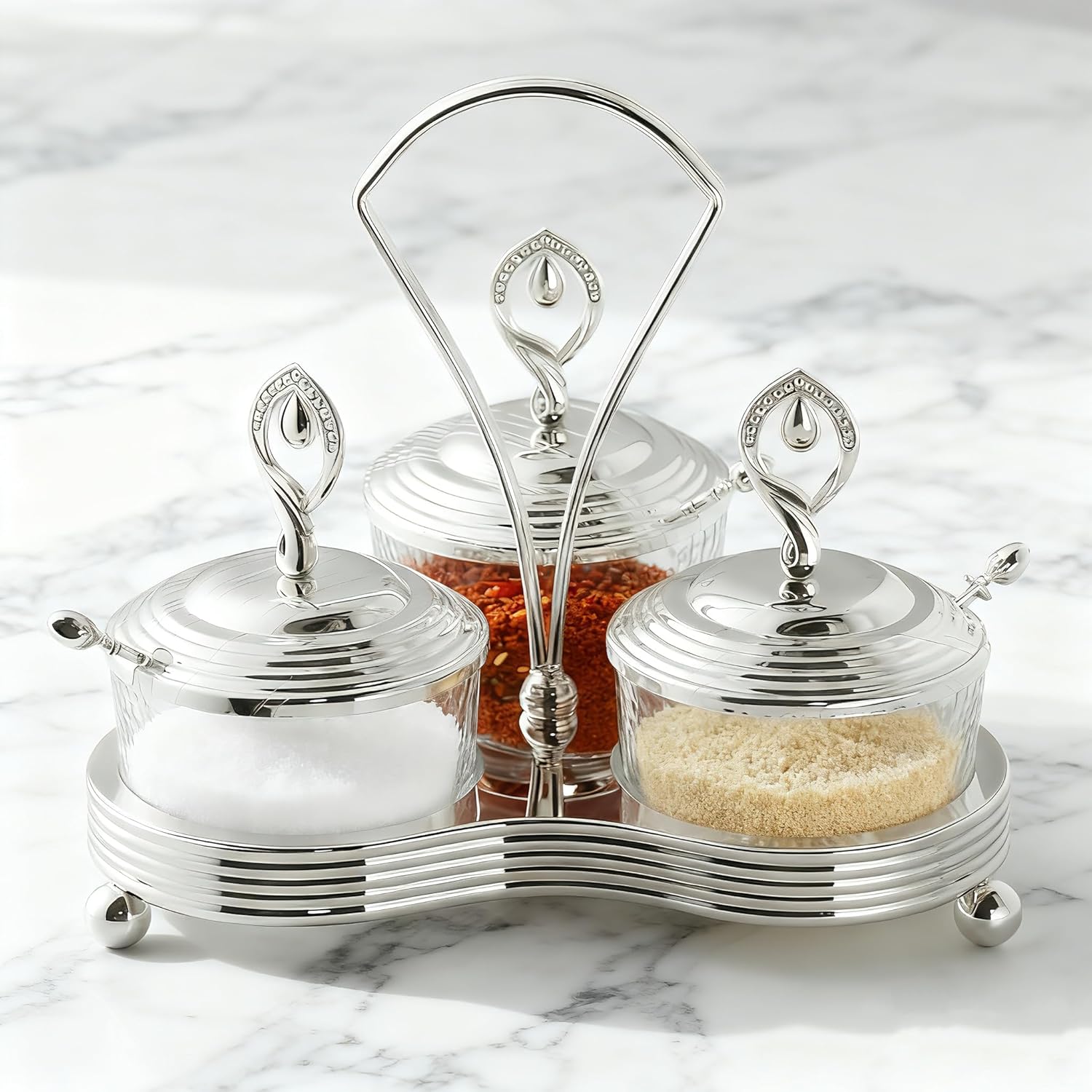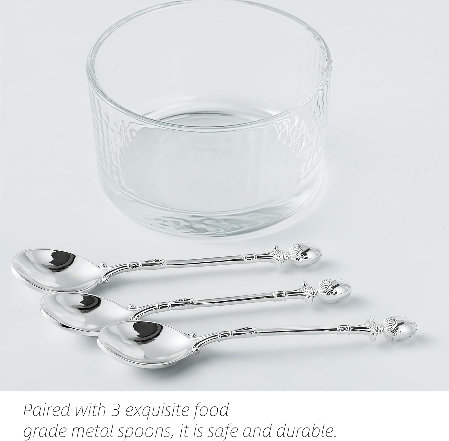 The set includes: Base: 1 piece Glass bowls: 3 pieces Bowl lids: 3 pieces Spoons: 3 pieces Single bowl capacity: 250ml Net weight: 1250 grams
