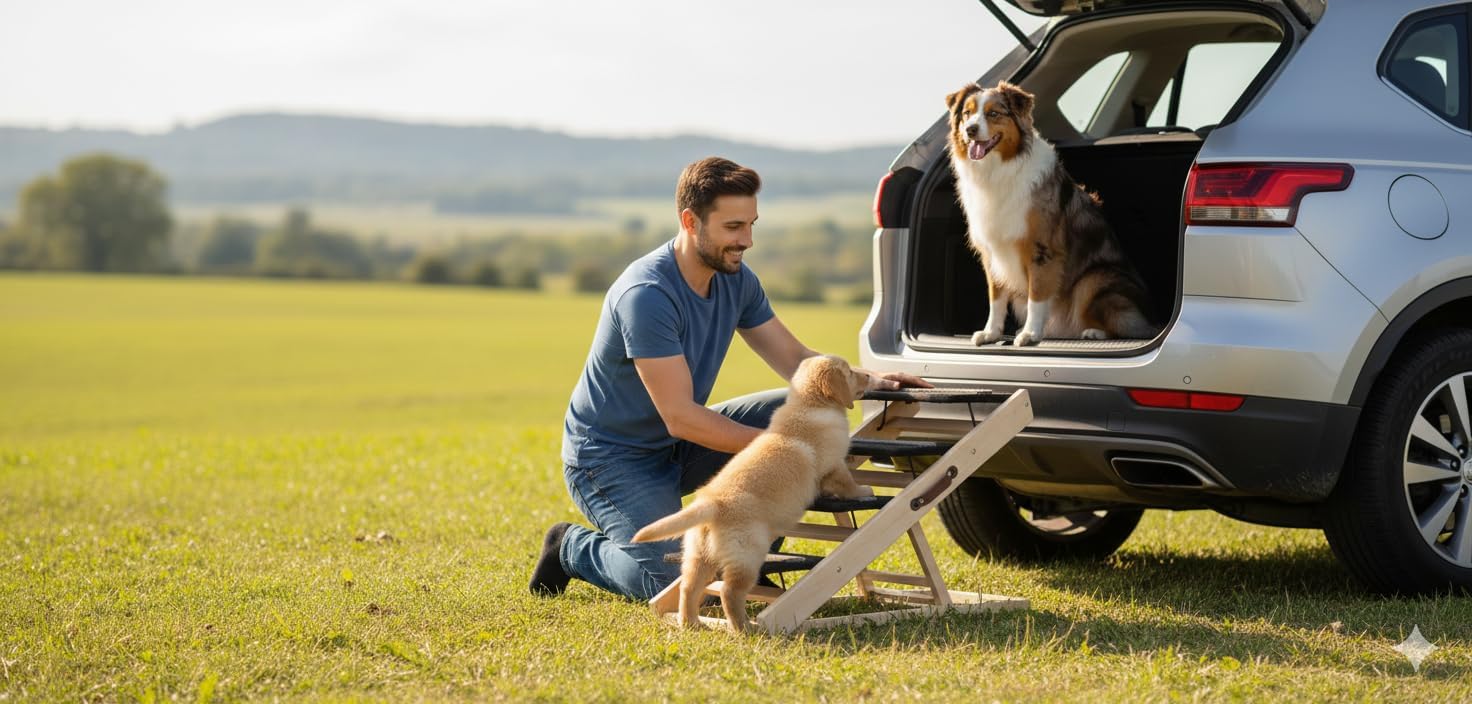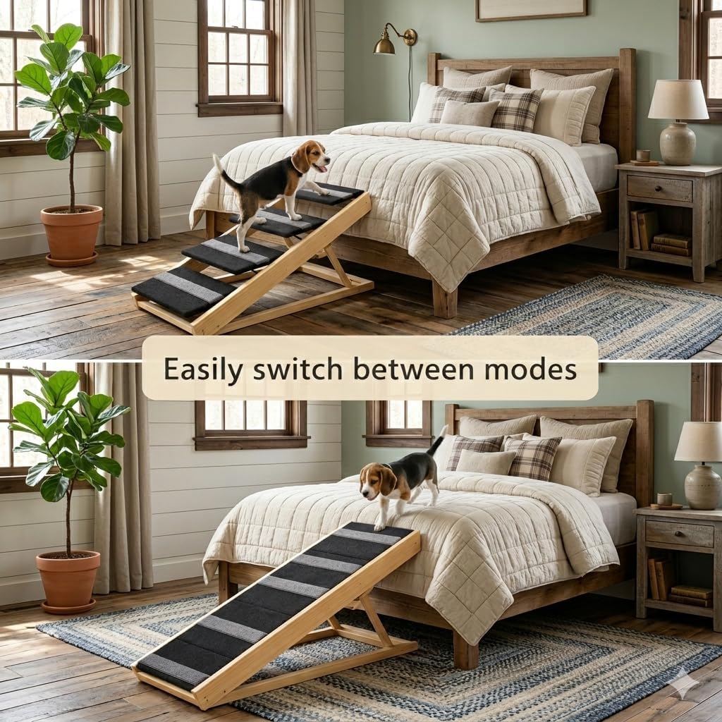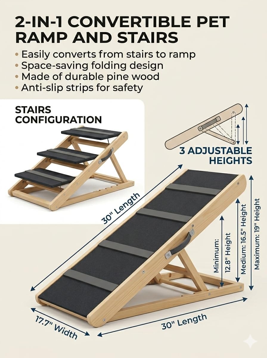 Give Your Pet a Safer, More Comfortable Way to ClimbHelp your beloved pet reach their favorite spots with confidence and ease. This 2-in-1 Convertible Dog Ramp and Pet Steps is thoughtfully designed to protect your pet’s joints while providing a safe, stable, and stress-free climbing experience. Perfect for small, senior, injured, or overweight dogs and cats, this ramp eliminates the need for jumping and reduces the risk of slips or falls.2-in-1 Convertible Design for Every NeedEasily transform the ramp into pet steps or a full incline ramp depending on your pet’s size and mobility. Whether your pet needs gentle steps or a longer slope, this versatile design adapts effortlessly to beds, sofas, and vehicles—making everyday moments safer and more accessible.Secure, Non-Slip Surface for Maximum ConfidenceThe walking surface is covered with a high-traction, non-slip fabric that provides superior grip and paw support. This added stability helps prevent slipping, giving your pet the confidence to climb independently—especially beneficial for senior pets or those with limited mobility.Foldable, Portable & Easy to StoreDesigned with convenience in mind, the ramp folds flat for easy transport and compact storage. Store it neatly under the bed, in room corners, or inside your car. A secure locking buckle ensures the ramp stays safely closed when not in use, making it ideal for both home and travel.Strong, Stable & Built to LastCrafted from heavy-duty solid pine wood, this pet ramp offers exceptional durability and stability. Its free-standing design requires no support from furniture or vehicles and safely supports pets up to 220 lbs, giving you peace of mind with every use.Protect Your Pet’s Health & MobilityBy reducing impact on paws, joints, and muscles, this ramp helps prevent long-term joint strain and discomfort. It’s the perfect solution to protect your pet’s mobility while keeping them active, comfortable, and happy for years to come.