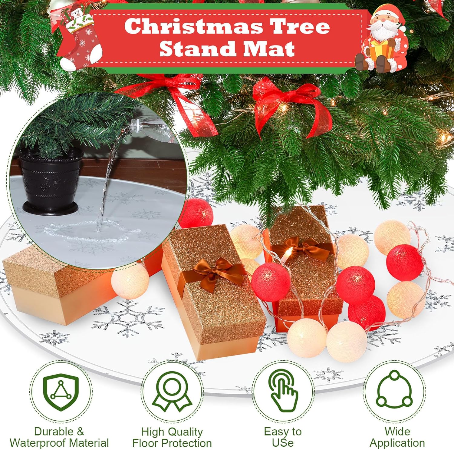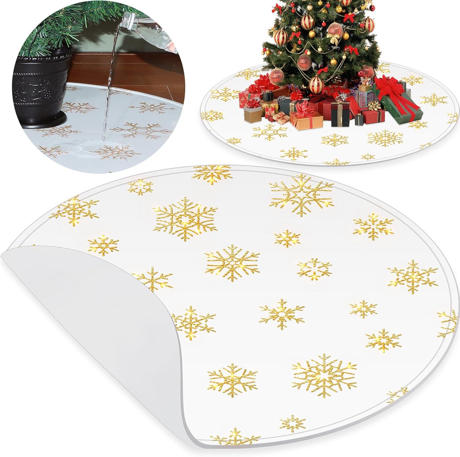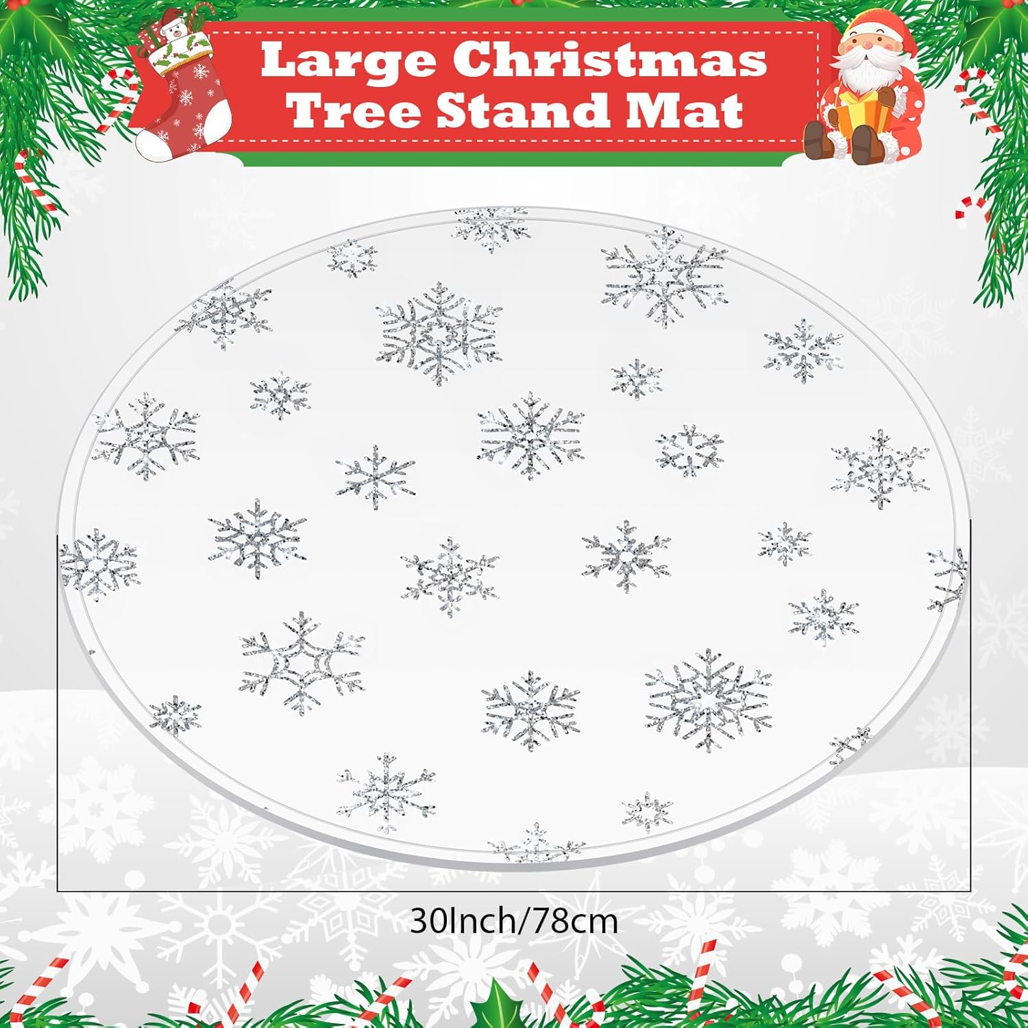 Features: Waterproof Christmas tree mat: This tree stand pad for Christmas is made of silicone, safe and reliable, waterproof, easy to clean and maintain, which can provide you a long time use. Christmas tree floor protection pad: Our Christmas tree mat can protect your floors from scratches, dents or water damage caused by the Christmas tree stand, a nice helper for your Christmas home decoration. Specifications: Material: silicone Color: white, silver Size: approx. 30 inch in diameter Package includes: 1 x Christmas tree snowflake mat Notes: Manual measurement, please allow slight errors on size. The color may exist a slight difference due to different screen displays.