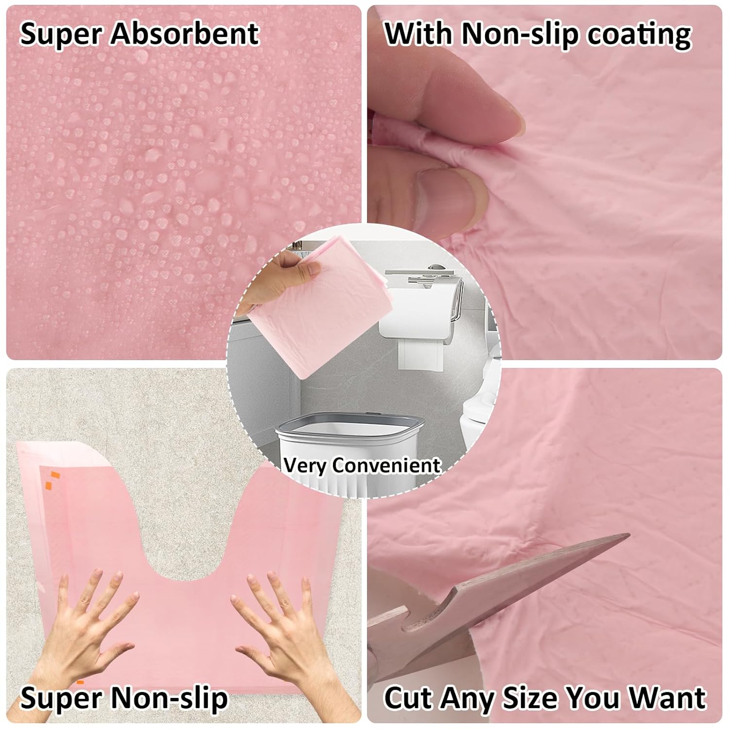 LOPYXBR Disposable Toilet Mats LOPYXBR disposable u-shaped toilet pee guard for floor is ideal for both residential and public toilets, offering important help to individuals undergoing toilet training or facing issues like incontinence, pregnancy, Alzheimer's, bladder dysfunction, prostatic diseases, and more Specification Size: 24x24 inch/60x60 cm Color: Pink Materials: non-woven fabric Package included 30 PCS non-slip around the toilet pee mat Feature Our disposable u-shaped toilet pee guard for floor features a front side constructed from premium absorbent PP non-woven fabric, coupled with a non-slip coating on the reverse These disposable toilet mats have PE anti-slip particles significantly increase friction between the floor and the mat. Unlike other disposable toilet mats that use tape, our non-slip around the toilet pee mat does not have tape, so there are no adhesive residue marks that are difficult to clean up The u-shaped super absorbent around toilet floor protector from urine is disposable, you can just place it on the floor next to the toilet base, and discard toilet floor mat for urine after use, there is no need to wash and mop, saving your time and energy NOTE: Before using our disposable u-shaped toilet pee guard for floor, please ensure that the floor is dry and clean to maximize the friction between the toilet mats and the floor