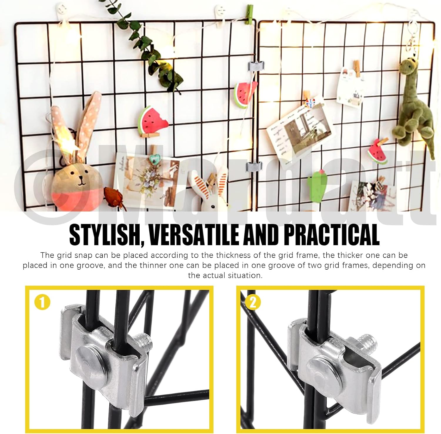 Mardatt 45 Pcs Black Wall Grid Wire Panel with S Hooks Wooden Clips Nails and Rope, Photograph Wall Mesh Organizer Photo Hanging Display Memo Board Wall DIY Decor for Home Office (40x30 cm) Product Specification: Material: metal and plastic coated Color: Black Size: 40x30 cm/ 15.74” *11.8” How to Use: Step1 : Install the no-trace hooks on the wall; Step 2 Put the metal grid into the connecting buckle; Step 3: put the other half of the connecting buckle and screw tighten. Step 4: drop the matching hook into the wall, then hang the grid on the hook to complete the installation. Why Choose Us: rust and corrosion resistant material organize small items & wall decoration Design for dining room, living room, kitchen, bedroom, apartment,restaurant,dorm room, office use. Package Include: 4 pcs--------- black metal grids 10 pcs--------- wooden color clips10 pcs--------- wooden heart shape clips 1 pcs--------- 10 meters length rope 8 pcs--------- no-trace hooks 4 pcs--------- grid wall joining clips 8 pcs--------- metal S hooks totally 45 PcsNote: According to the actual situation, different numbers of no-trace hook are used to support the suspended weight to prevent the grid from falling.