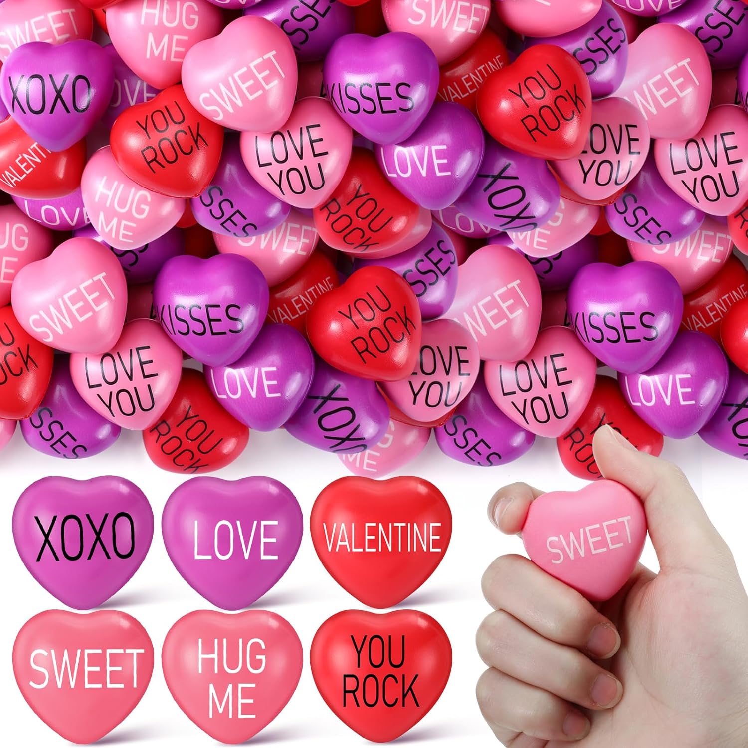 Features: More than just stress relief, these foam squeeze balls make nice party favors, gifts, and even therapy tools for hand strength. Take them anywhere—pocket, bag, or hand for instant stress relief, wherever you are. Made from elastic PU foam, these motivational stress balls are soft yet durable, ensuring long-lasting use. Specifications: Main Material: PU foam Size: 1.5 inches Package includes: 300 x heart shaped stress balls Notes: Manual measurement, please allow slight errors on size. The color may exist a slight difference due to different screen displays. Please measure the size before placing an order.