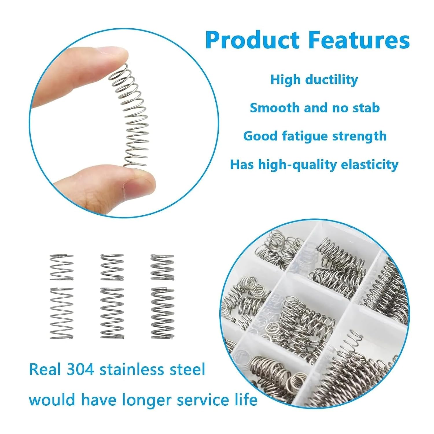 Product Name:240PCS Premium Stainless Steel Compression Spring Assortment KitMaterial: Stainless SteelDIY Supplies : MetalworkingMaterial : Stainless steelOrigin : Mainland China