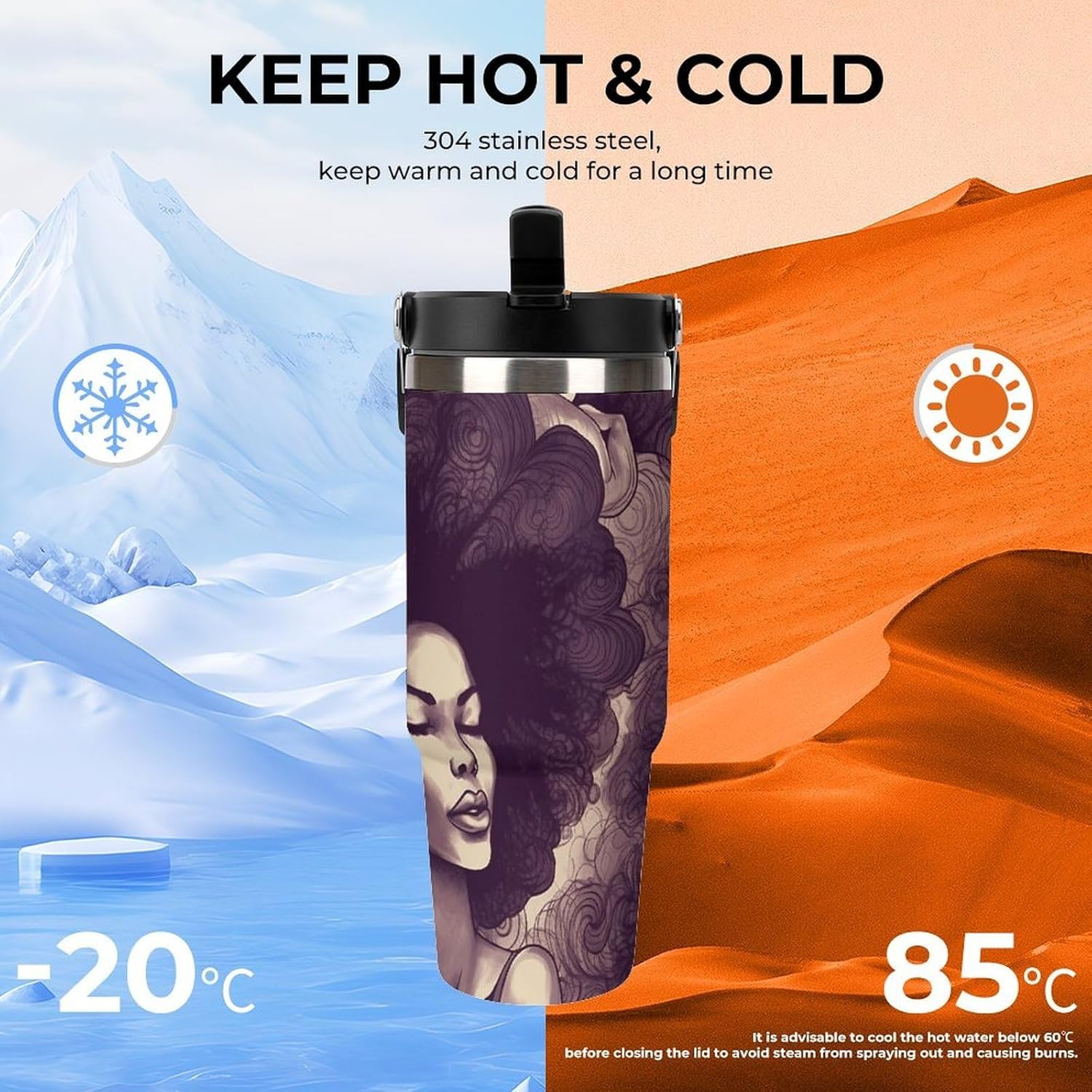 Our African Hair Black Women travel water bottle is made of food-grade stainless steel. The wide mouth design makes it easy to clean and add ice, and the powder-coated exterior is non-slip and durable, ensuring driving safety.Whether you prefer sipping or quenching your thirst, this personalized insulated mug has you covered. Featuring a splash-proof straw design, a sealing ring securely holds the reusable straw, and a drinking spout and full-coverage lid for enhanced leak-proof performance, this mug allows you to easily carry ice water to work, meetings, the gym, or on trips.You can give it to your friends and family as a birthday, Mother's Day, Father's Day, New Year's, Thanksgiving, and holiday gift. It's a thoughtful present.