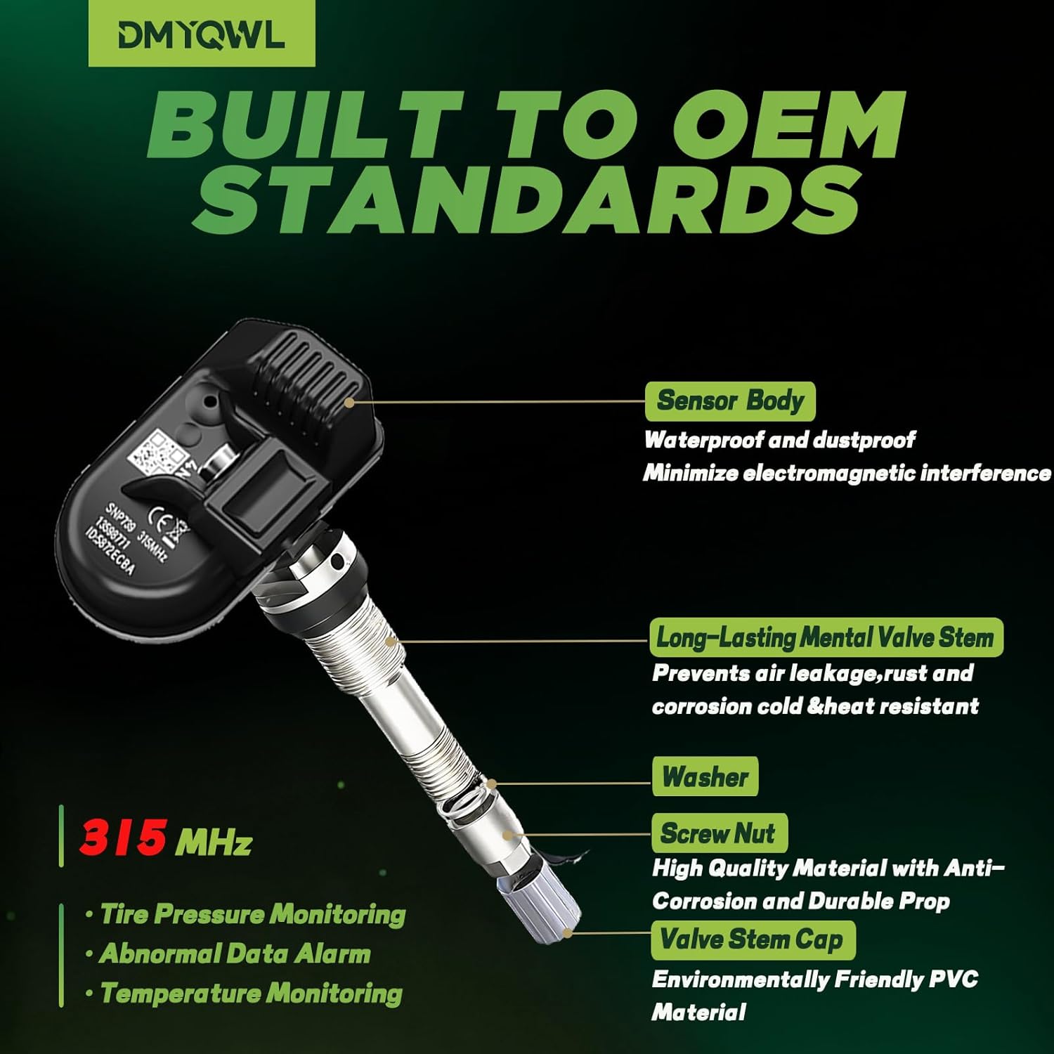 | Specific Uses For Product | 【Brand 】:DMYQWL 【Product Name】:315Mhz Pre-Programmed Tire Pressure Monitoring Sensor (TPMS) 【Material Composition】:Metal&Plastic 【Frequency】315MHz 【Number of Items】:Set of 4 【Applicable Models】:Compatible with: ★ FORD F150 (2015-2024) | F250 (2015-2023) | F350 (2015-2023) | Explorer (2015-2024) | Edge (2015-2023)| Mustang (2015-2024) | Fusion (2016-2021)| Escape (2020-2024)| Ranger(2019-2021)| Expedition (2017-2024)|Bronco(2020-2023)|BroncoSport(2020-2024)|Transit(2019-2021)|Maverick(2021-2024)| Ecosport(2017-2023)|E-150/250/350(2020-2023); ★ Lincoln MKX (2015-2024)|MKC (2017-2020)|Corsair (2020-2021)|MKZ (2016-2021). |