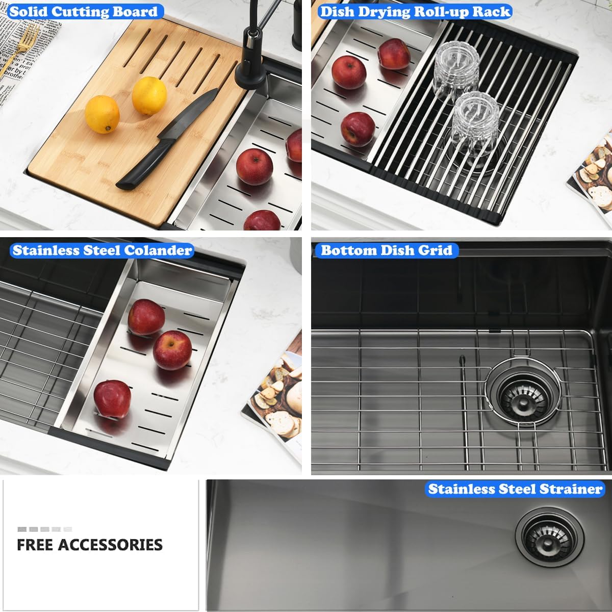 Benefits & Features 1 : Workstation Sink Design :The undermount workstation sink with single track - ledges on the front and back provide a track for sliding built-in accessories,allows you to work right over the sink while minimizing clutter on the kitchen counter。include placement of bamboo cutting board, colander and roll-up dish drying rack, saving more workspace. 2:32 inch undermount sink : The 32 Undermount kitchen sink is constructed by 304 stainless steel,with a black NANO-PVD finish for high scratch and stain resistance, easy cleaning and long-lasting durability, added R10 design could let your wiping reach to each corner, easy to clean and long-lasting. 3:Sloped bottom & X-shape Fast Drainage :Rear drainage hole design increases the space for use of the cabinet under the sink. drain hole and X grooves water guide line on bottom, which is faster to remove water. X-shape flow line to avoid clogging. while at the same time retaining elegant look and easy to clean. 4:Noise Cessation & Moisture Barrier :rubber padding on the sink bottom effectively minimize condensation and noise. Use 3mm sound guard undercoating and thick rubber padding,Noise-proof bottom rubber pads effectively cancel noise from daily use,absorb sound from the source, and isolate condensate. 5:32 x 18 Stainless Steel Undermount Kitchen Sink : Exterior Dimensions: 32" Width (Side To Side) x 18" Depth (Front To Back); Interior Dimensions: 30" Width x 16" Depth x 10" Height. Countertop Cutout Size: 30" W x 16" D x R10 mm. Standard 3.5" drain openings will fit any garbage disposal unit. Item : Undermount sinks DETAILS DETAILS Product Dimensions: 32x 18 x 10inches Item Weight: 30 pounds Color: Black Material/Finish Type: T304 Brushed Satin Stainless Steel Installation Method :Undermount Item Package Quantity : 1 Number Of Basins: 1 ACCESSORIES Included Components Sink,Cutting Board,Dish Drying Rack,Stainless Steel Colander, Strainer Drain&Bottom Grid,cut-out template, mounting brackets。