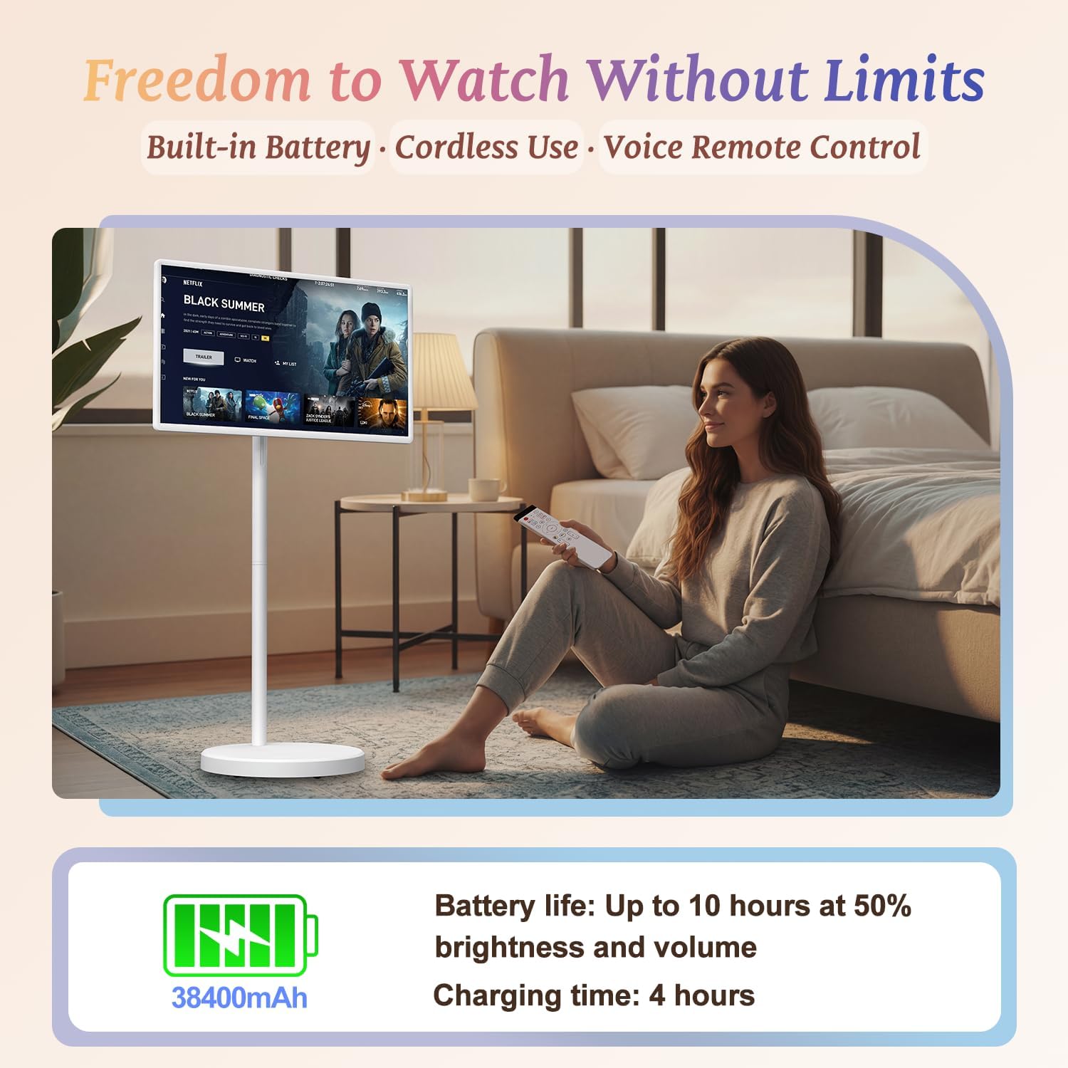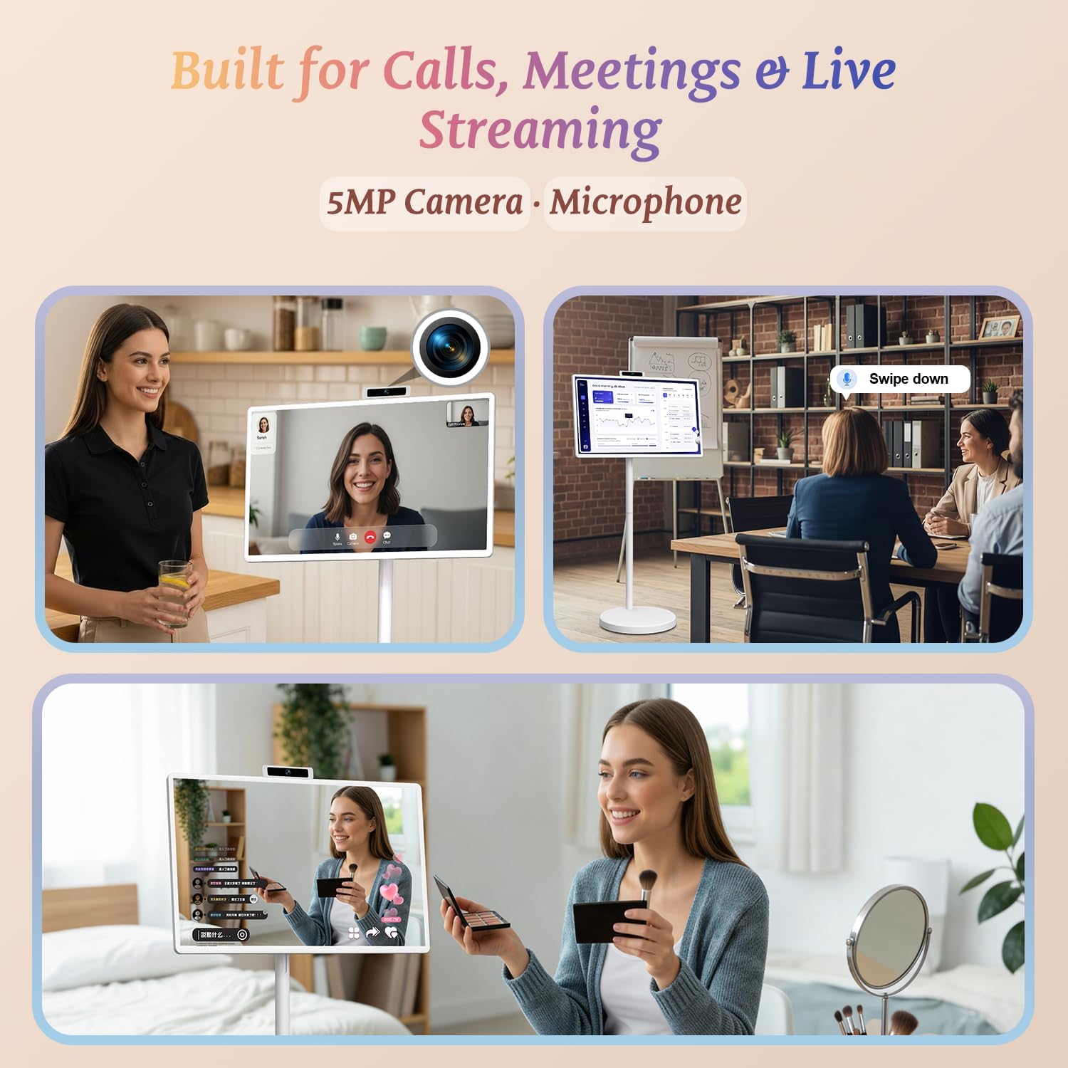 | Specific Uses For Product | Home Entertainment; Bedroom TV; Home Office Display; Video Calls & Online Meetings; Fitness & Workout Screen; Kitchen TV / Cooking Videos; Online Learning / Classes; Second Screen for Laptop; Streaming Media; Portable TV for Living Room; Interactive Touch Display; Presentations & Demonstrations; Digital Signage |