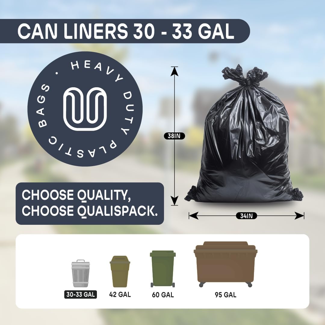 The Qualispack 33 Gallon Can Liner is designed to provide reliable and heavy-duty waste disposal solutions. Measuring 34x38 inches with a 1.2 MIL thickness, these can liners are built to withstand the toughest trash loads. Made from high-quality black low-density polyethylene, they offer exceptional durability and resistance to punctures and tears. Perfect For: -Commercial and industrial waste management -Construction sites and renovation projects -Outdoor events and large gatherings -Residential use for larger trash cans