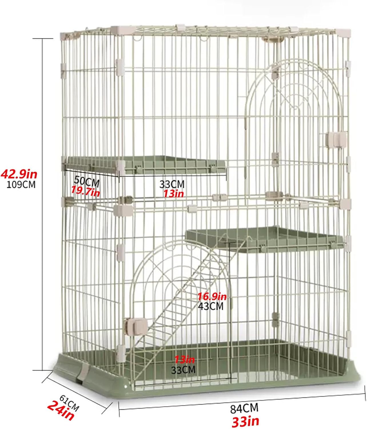 With its 3/4-tier structure, this cat cage offers ample room for your cats to play, explore, and rest comfortably. Made with high-quality materials, it guarantees both durability and stability.Details:Small Spaced Iron Mesh: The spacing between each wire is small enough that cats can climb or jump without getting hurt. And it also prevents kittens from running out of their cages, keeping pets safe.SpecificationsMaterial: Iron netColor: Pink, Green, GrayStyle: ModernTarget Species: CatProcess: Baking, PaintingNumber of Tiers: 3/4Assembly Required: YesMount Type: Floor StandingNumber of Cats Accommodated: 1-3Product Size: 30*20*53"/76*50*133cm , 33*24*64"/84*61*163cm , 39*26*71"/100*65*180cm , 30*20*35"/76*50*89cm , 33*24*43"/84*61*109cm , 39*26*47"/100*65*120cmPackage List:Cat cage *1Please note:1. While we display the most accurate color possible, there is likely tobe variations in color due to differences in computer monitors.2. Manual measurement, the size of the product there will be 1-3 cm error.3. The cat supplies in the photo are for display and reference purposes only (not for sale).4.Part of the paint will fall off during transportation, but it will not affect the use, please purchase with caution!