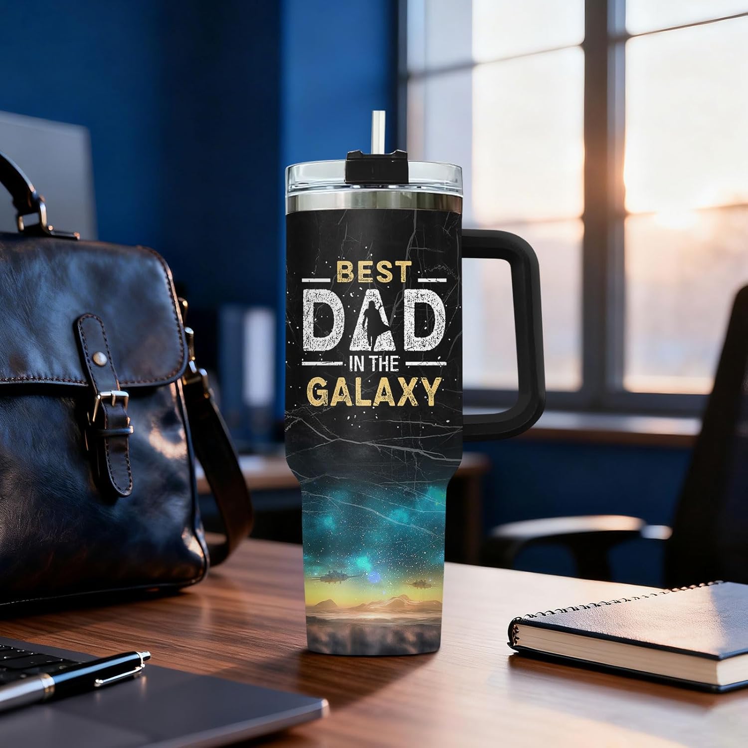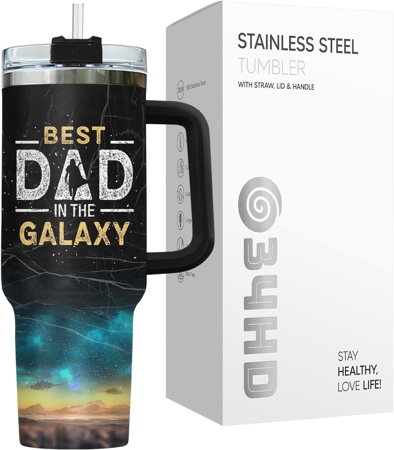 For the Best Dad in the Galaxy! Give the hero in your life a cup that matches his legendary status with the 34HD Dadalorian Tumbler. This 40oz stainless steel mug combines a love for space adventures with the pride of fatherhood, making it the "way" to stay hydrated. Why the Dadalorian Tumbler is a Galactic Favorite: - Stunning Cinematic Art: The high-quality 2D print features a vibrant retro sunset and a mysterious starry galaxy landscape that wraps around the tumbler. The silhouette imagery of a protector and a small companion celebrates the bond between father and child. - Humorous & Heroic Quote: Tired of ordinary "World's Best Dad" mugs? This tumbler defines a "Dadalorian" as a father who is "just way cooler" and "exceptional". - Built for Universal Use: With its massive 40oz capacity, it’s perfect for long commutes, office work, or weekend adventures. The ergonomic black handle provides a secure grip, and the straw-friendly lid ensures mess-free sipping. - Advanced Temperature Shield: Double-wall vacuum insulation keeps his "fuel" hot for 6 hours or his favorite cold drink icy for up to 12 hours. - The Ultimate Bounty Gift: Surprise any sci-fi enthusiast dad with a gift that recognizes his strength, humor, and cosmic level of awesomeness. This is the way... to a better drink. Add the 34HD "Dadalorian" Galaxy Tumbler to your cart today.