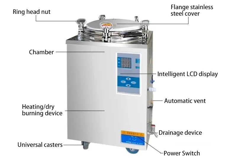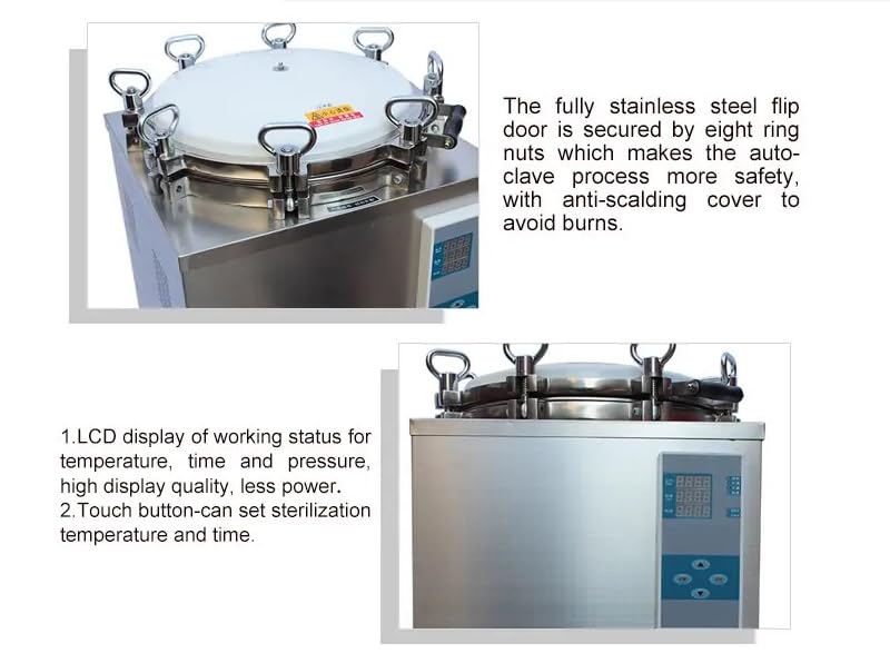 Model:LS-35LD Chamber volume:35L working pressure :0.22MPa Working temperature :134ºC Max working pressure:0.23Mpa Heat average:≤±1ºC Timer:0~99min or 0-99hour59min Adjustment of temperature:105~134ºC Power:2.5Kw/110V.60Hz Overall dimension(mm) :470×450×840 Transport dimension(mm):570×570×1000 G.W/N.W:64Kg/ 64Kg