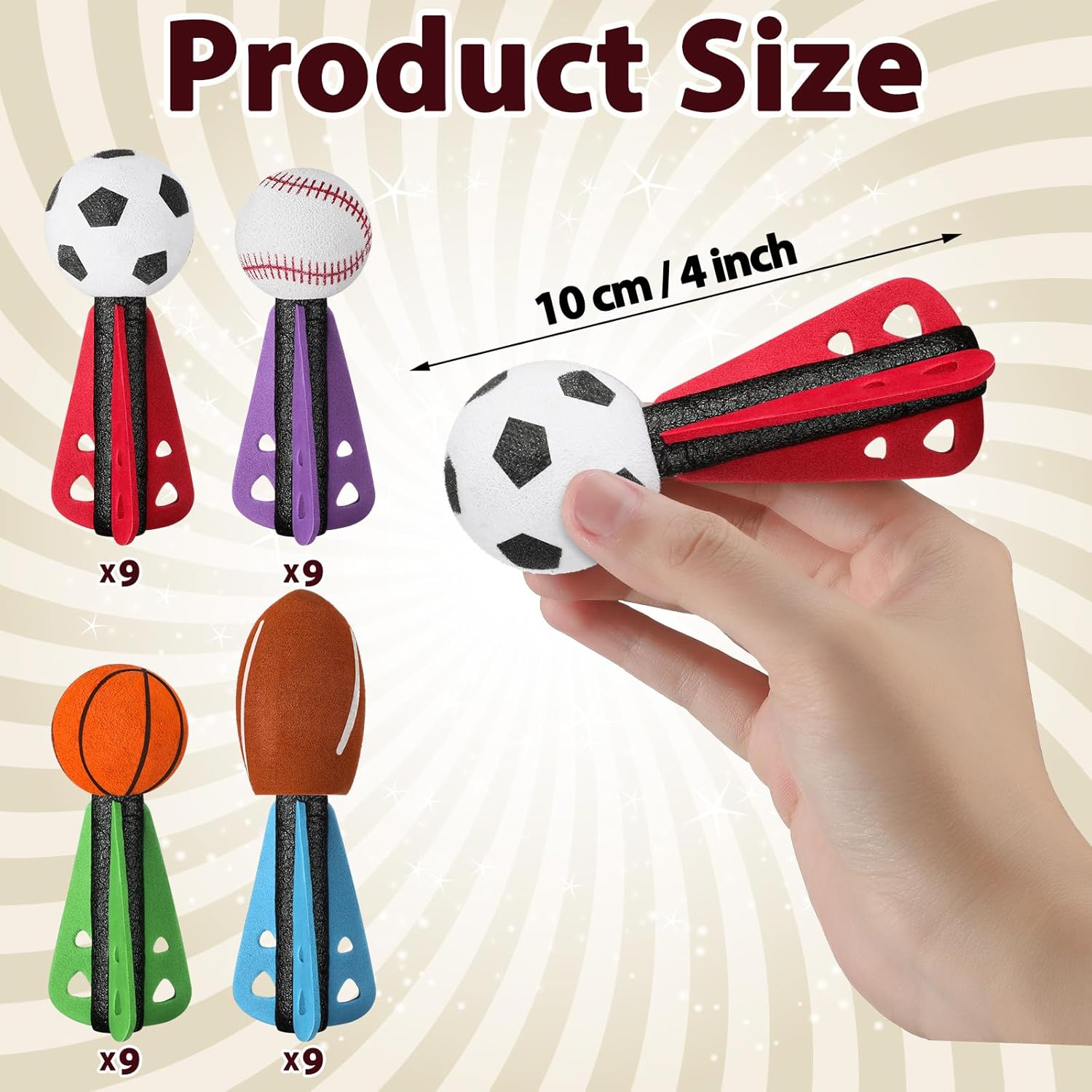 Features: Every set of these sports party favor balls includes a variety of designs including baseball, basketball, football, and rugby. These mini foam sports balls make impressive rocket party favors. They can be applied as props for party games, and add a fun, interactive element to gatherings or events. Specifications: Material: EVA Color: as shown in the picture Size: about 10 cm/ 4 inch Package includes: 36 x Mini foam sports balls Notes: it's recommended to use under the supervision of adults in case of choking risk. Manual measurement, please allow slight errors on size. The color may exist a slight difference due to different screen displays.