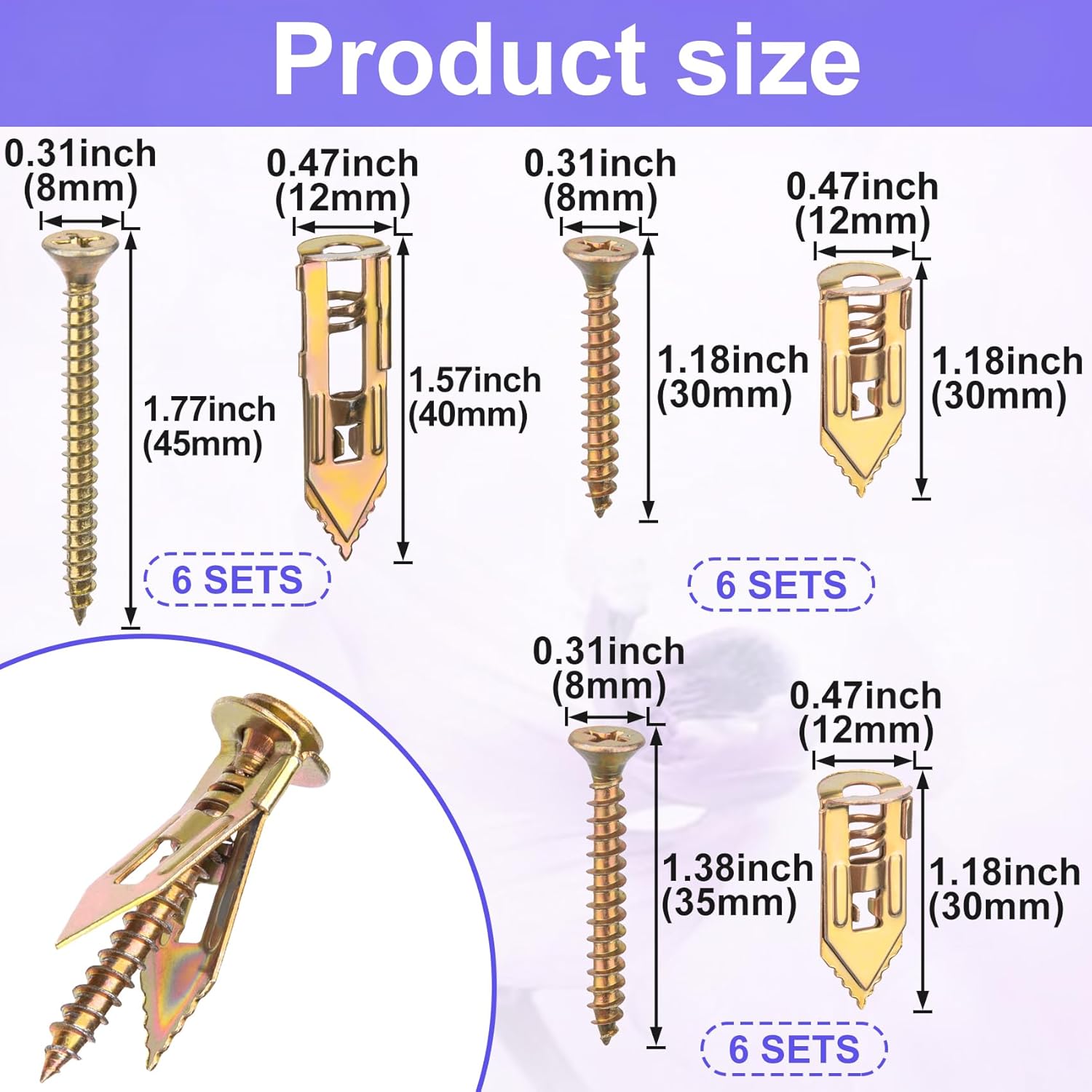 Product Description BEIQIYA 36pcs Self-Drilling Drywall Anchors, Heavy Duty Expansion Screws, Metal Screws and Anchors Kits with 3 Sizes for Hanging Picture Frames Curtains Lights Shelves Cabinets Paintings (18 Sets) Specification: Material: Metal How to Use: These self drilling anchor screws work by twisting directly into drywall without pre-drilling. You can start by placing the anchor on the wall and turning it until it’s flush, then adding the screw. Function: These self drilling drywall anchors secure items to walls, preventing loosening or falling. Your picture frames or shelves will stay in place, thanks to the metal anchors’ tight grip after installation. Wide Application: These metal wall anchors work with drywall, gypsum boards, and lightweight bricks. You can use the metal screw anchors to hang picture frames, small shelves, or wall clocks. Package Include: 36pcs Self-Drilling Drywall Anchors
