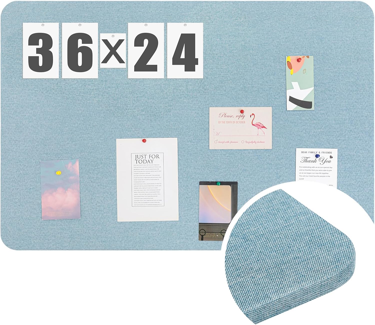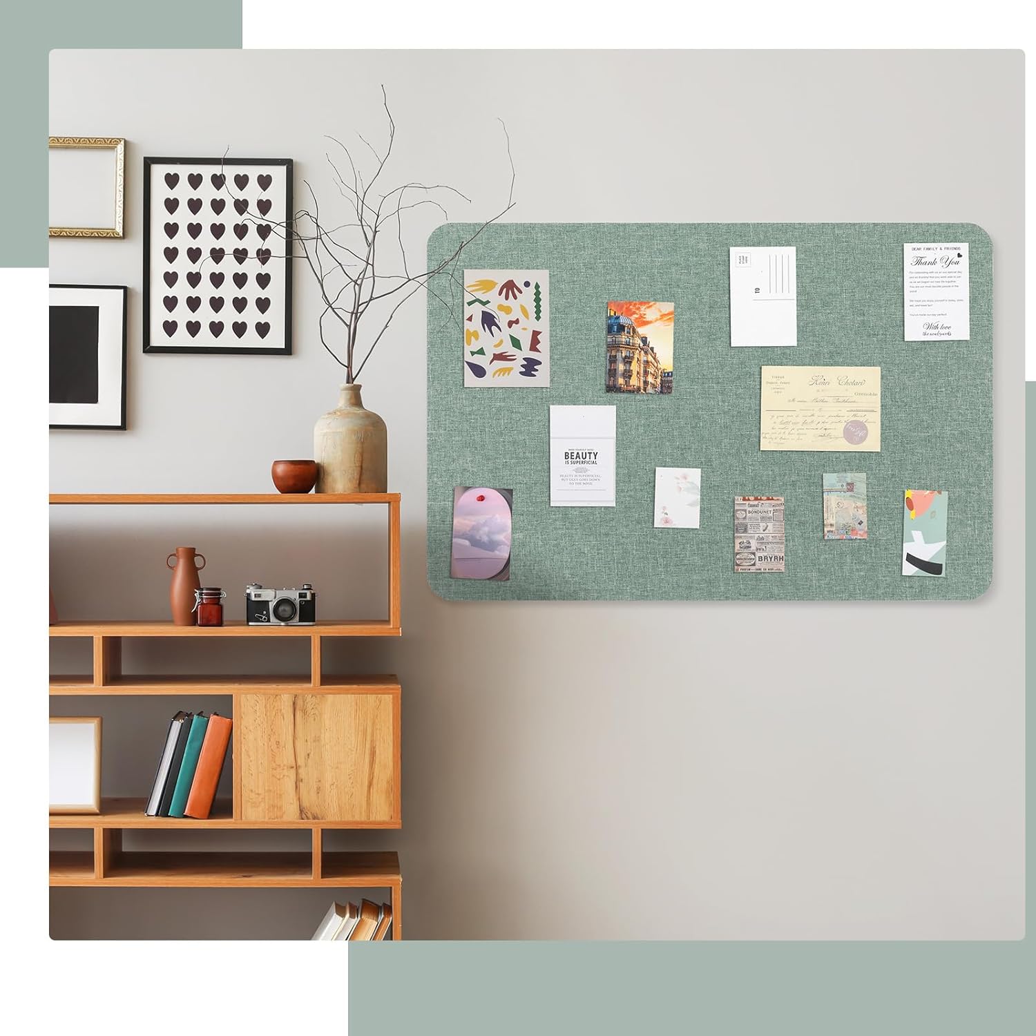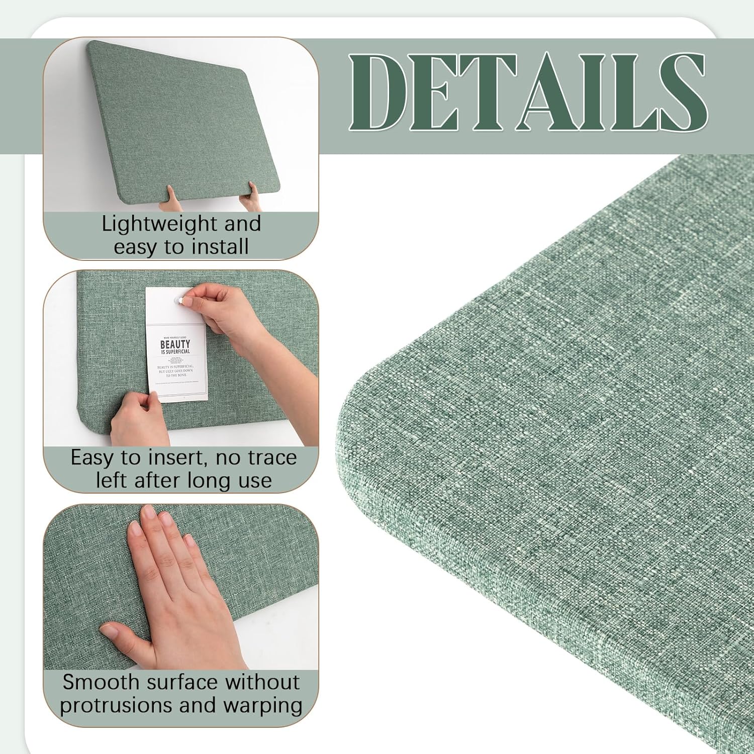 Features: Our office bulletin board, linen, a natural material, and felt, typically made from renewable materials, underline our commitment to environmental sustainability. Choosing our product means investing in a solution that's as gentle on our planet as it is on your walls. Our fabric bulletin board with its lightweight construction ensures an easy installation process. With a movable double sided tape included in the packaging, you can securely paste it on your preferred places without worries about it falling off. Specifications: Material: felt inner pad, linen outer Color: sage green color Size: about 36 x 24 inches/ 90 x 60 cm Thickness: about 0.35 inches Package includes: 1 x Fabric bulletin board Notes: Manual measurement, please allow slight errors on size. The color may exist a slight difference due to different screen displays