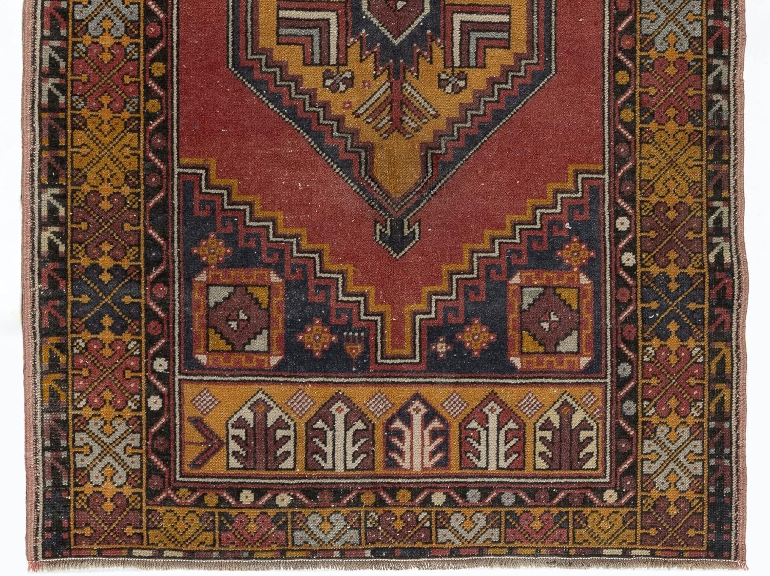 This gorgeous vintage hand-knotted Turkish area rug. It is made of soft, lustrous sheep's wool on wool foundation, is in very good condition, sturdy and clean as a brand new rug. It features a well-drawn geometric design with a medallion at its center. Size: 3.8 x 5.8 Ft (114 x 175 cm) Materials: Wool Ref No: C1331