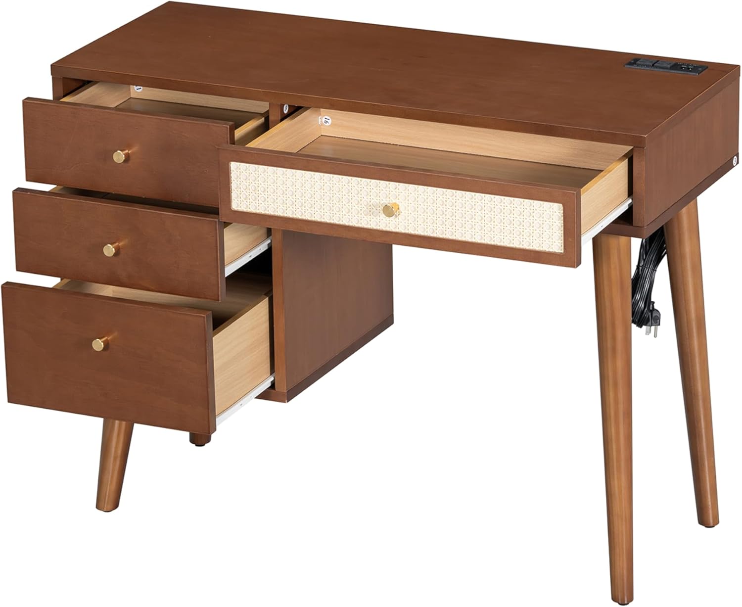 This dressing table is retro and modern in design. It uses rattan to decorate the drawers, creating a simple and elegant atmosphere. The tabletop has a charging plug and USB port for connecting the mirror with light and charging the mobile phone, tablet fill light, etc. It is very practical! There are 3 large storage drawers on the left side of the table, which are also suitable for placing cosmetics, hair dryers, curling irons, books, clothes, etc. The stool is covered with cushions, and it will feel very comfortable to sit on it. In short, this set is very suitable for your bedroom.Features:Product Type:Makeup Vanity SetColor:Black/WalnutProduct material:MDF+Plywood+Rattan+Pine Wood+MetalDressing Table Size: 39"W x 15.6"D x 29.6"HStool Size: 12.5"W x 12.5"D x 16.4"HDetail Product Dimension:Please refer to the Size imageWeight CapacityMake up tabletop: 100lbsDrawer: 10 lbsStool: 200lbsAssembly Required:YesCountry of Origin:VietnamNotes1. Manual measurement has been used,there may be some reasonable error.2. All the pictures are taken by actual samples, slight chromatic aberration may occur due to lighting or display.