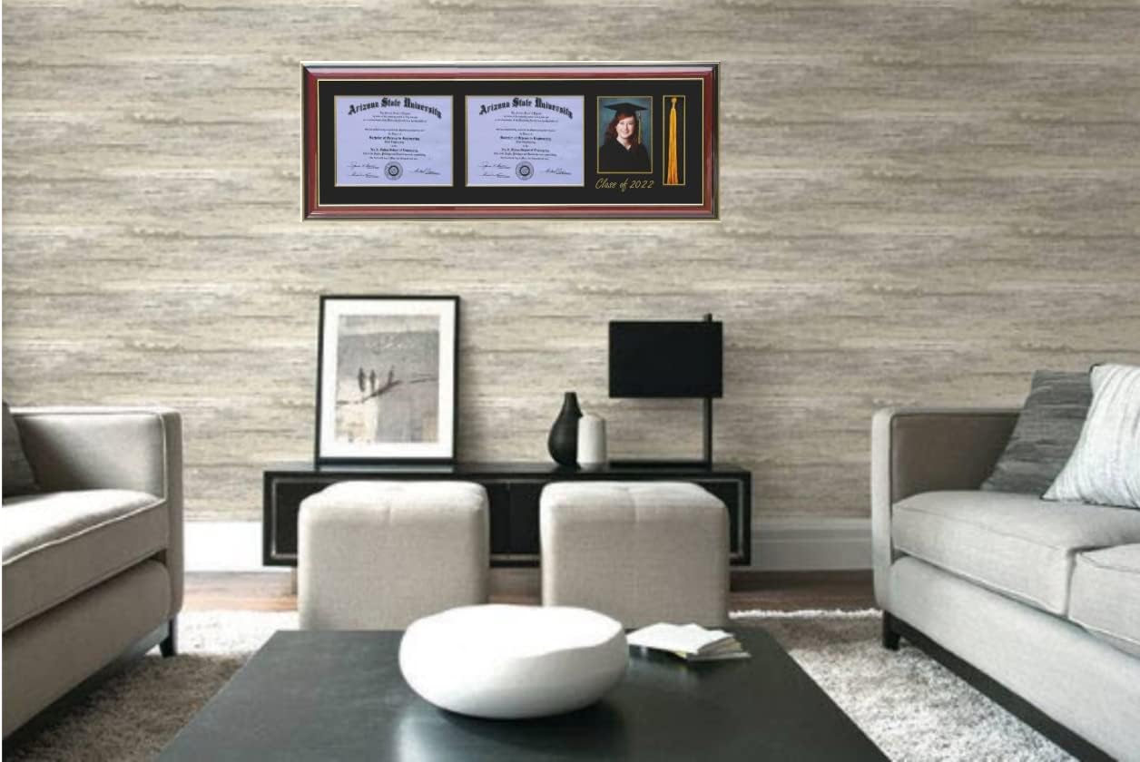 This beautiful horizontal frame will hold two diplomas with a tassel and a 5x7 picture. Please note that the tassel is not included. For personalization we are only able to print the graduation class year. Please see pictures for reference. NEED A DIFFERENT SIZE? Visit our storefront 3ART.