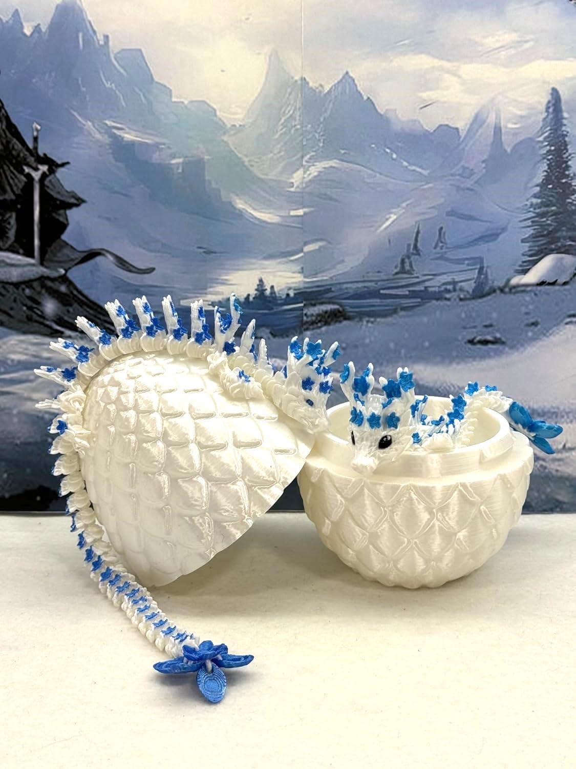 3D Printed enchanting Mother and child Articulated Cherry Blossom Dragon - a mystical creature that brings a touch of fantasy to your world. Unveil the mystery of the Dragon Egg and this White and Blue Cherry Blossom Dragon ( Mother dragon measures 12" long) a captivating fusion of elegance and fantasy. Encased within a meticulously designed crystal egg, this tiny dragon reveals itself with a symphony of colors - a testament to its magical heritage. ------- Small Components Advisory: ------- Please note that this product may contain small components and might not be suitable for very young children. Given the characteristics of 3D printing, there is a potential for small components to detach if handled aggressively or dropped. Therefore, we advise against allowing younger children to interact with the dragon. Please consider that 3D printed objects might include minor imperfections such as layer lines. These are a natural and inherent aspect of the printing process. We strive to produce the highest quality items, and these imperfections contribute to the unique character of each piece. Recall the unique creation of each dragon, crafted exclusively for you. The color selections available are depicted in the provided photos. Please be aware that variations in color may occur due to discrepancies in filament production and the characteristics of the monitor or screen you are utilizing to view the listing. Additionally, the arrangement of prints using multi-colored filament rolls can influence color distribution. ------- Licensing Information: ------- Authorized Design: NOHo3D holds the official authorization for the production of this exquisite design created by CinderWing3D.